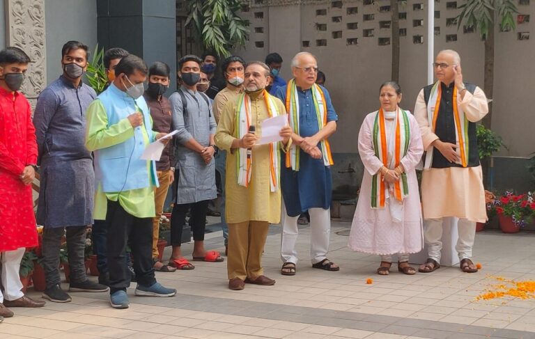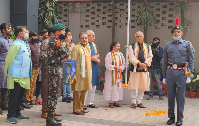 The hoisting of the national flag was done by the Hony. Secretary of the society Shri Pradip Sheth and Central Committee members Sri Sailesh Desai & Smt. Nalini Parekh, and was followed by the National Anthem. A troop of 40 NCC cadets briskly marched saluting the national flag.