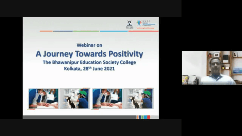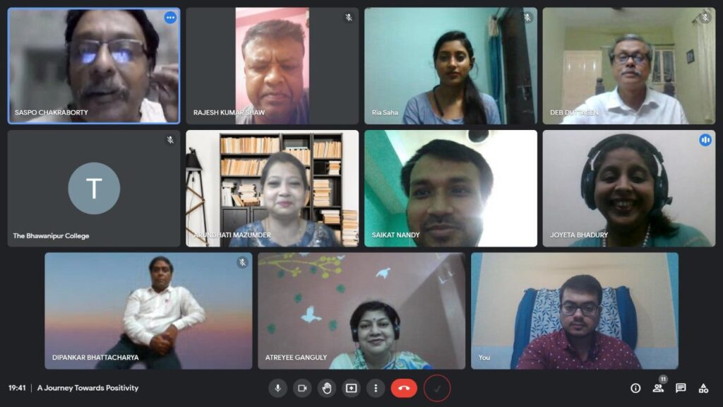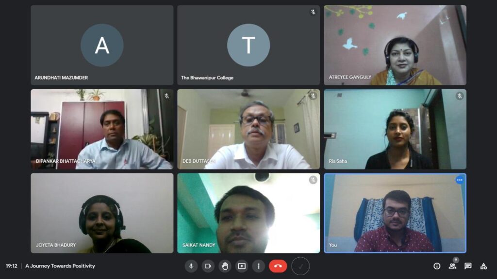 A webinar on “A Journey Towards Positivity” was organized by the Department of Commerce, UG (Afternoon and Evening Section) on 28th of June, 2021 for the students of the Evening Section, using the Google Meet platform. The keynote speakers for the webinar were Dr. Suddhasatwya Chatterjee (Senior Physician, Department of International Medicine and Rheumatology, Apollo Gleneagles Hospitals Limited Kolkata), Ms. Chaitali Das (Internationally acclaimed Social Entrepreneur, Jute Revivalist) and Mr. Bikram Kumar Das (State Engagement Officer, NSDC). About a 100 participants comprising keynote speakers, faculty members and students of the Evening section of the Department of Commerce attended the webinar.