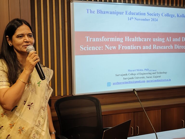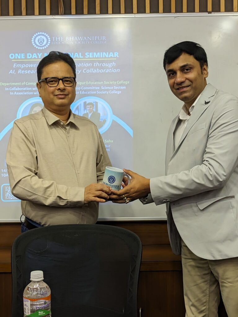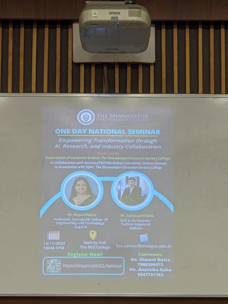 Faculties and Staffs: The Bhawanipur Education Society College – 21 Objective of the event: The event aimed to bridge the gap between research and industry by posing the fundamental role of artificial intelligence in driving technological advancements and revolution. Brief Description of the event: The Bhawanipur Education Society College held a one-day national seminar on November 14, 2024, named “Empowering Transformation through AI, Research, and Industry Collaboration.” Hosted by the Department of Computer Science, the event aimed to bridge the gap between research and industry by posing the fundamental role of artificial intelligence in driving technological advancements and revolution. The seminar featured prominent speakers including Dr. Mayuri Mehta, a distinguished professor from Sarvajanik College of Engineering and Technology, Gujarat, and Mr. Sabyasachi Saha, CEO & Co-Founder of Techno Exponent, Kolkata. The event attracted participants from a wide range of backgrounds, including students, researchers, and professors. Informative speeches were also delivered by several distinguished individuals who contributed to the success of the seminar. The Head of the Department of Computer Science, Mr. Sanjib Halder, along with Dr. Samir Kanti Dutta, Dean of the Science Department, Dr. Pinki Saha Sardar, Vice Principal of the Science Department, and Teacher in Charge, Dr. Subhabrata Ganguly, shared their thoughts on the significance of AI in modern education and its potential for shaping the future. They also provided valuable insights into the role of technology in advancing research, particularly in the context of AI, emphasizing the importance of interdisciplinary collaboration for driving innovation in this rapidly evolving field.  Their speeches further enriched the seminar, offering perspectives from various facets of academia and technology. In addition to BESC students, more than 40 students from nine other colleges across Kolkata participated in the seminar. These institutions included AJC Bose College, Syamaprasad College, NSHM, Bangabasi College, RCC Institute of Information Technology, Narasinha Dutt College, Vivekananda College, and Asutosh College, with attendees from diverse departments such as Computer Science, Mathematics, and Physics. The first half of the seminar featured Mr. Sabyasachi Saha, who informed the audience with his discussion on innovative AI applications, particularly in image and video analysis. He presented several practical projects, including an advanced AI model capable of extracting detailed vehicle information from video footage using artificial intelligent techniques. Another notable demonstration was a real-time clothing try on system used in the fashion industry. Through these examples, Mr. Saha emphasized how AI is transforming industries and improving real-world processes by applying theoretical concepts in practical settings. The second half of the seminar was led by Dr. Mayuri Mehta, who took a more academic approach, exploring the prospects of AI research and its potential to revolutionize various fields. Dr. Mehta, with her extensive experience in AI and machine learning, shared her valuable insights on the ongoing research trends and the future directions of AI. She discussed key areas such as machine learning, deep learning, and computer vision, and highlighted the interdisciplinary nature of AI, stressing the importance of collaboration between academia and industry for advancing AI technologies. The seminar concluded with a sense of enthusiasm and curiosity among the attendees, as many students expressed being deeply informed and inspired by the sessions. Mr. Saha’s engaging demonstrations of real- world AI applications and Dr. Mehta’s comprehensive exploration of AI research left the participants with a better understanding of how AI is reshaping industries and academia. Outcome of the event: The discussions and insights provided throughout the day not only broadened students’ knowledge but also encouraged them to explore the exciting opportunities in AI research and its applications in the real world.