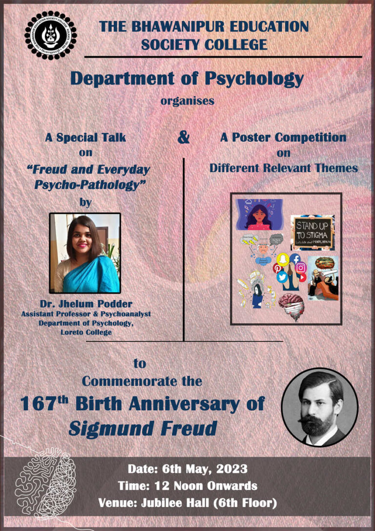 The Department of Psychology organized a talk on ‘Freud and Everyday Psychopathology’ on 6th May 2023, to commemorate 167th birth anniversary of Sigmund Freud. The talk was delivered by Dr. Jhelum Poddar, Psychoanalyst, and Assistant Professor of Department of Psychology, Loreto College, at Jubilee Hall, 12.30 pm onwards. The event began with a welcome note by Ms. Vidisha Roy, faculty of Department of Psychology, of The Bhawanipur Education Society College, on Sigmund Frued which was followed by an introductory speech by the Teacher-in-Charge of The Bhawanipur Education Society College, Dr. Subhabrata Gangopadhyay. Ms. Pooja Sengupta, faculty of Department of Psychology, of The Bhawanipur Education Society College, presented a speech to address the keynote speaker and to initiate the beginning of the first session of the event.
