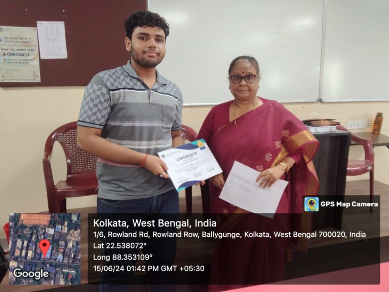 f. The prizes for the Highest and Second Highest Score in the University of Calcutta BA Semester III Honours in Political Science, 2023: Manu Kumar Gupta with an SGPA of 7.439 and Sudeshna Jha with an SGPA of 6.972, respectively;