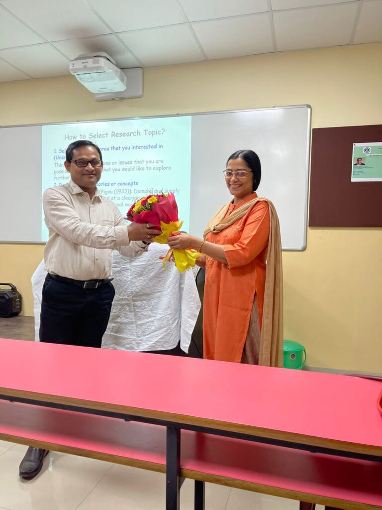 fundamental concepts of research, emphasizing the process of selecting a research area, topic, and title. He elaborated on the distinctions between primary and secondary data, illustrating various sources for data extraction. Dr. Bhuniya also addressed the importance of avoiding plagiarism and the proper usage of citations in research papers. Engaging with the students, Dr. Bhuniya explored their research interests and provided guidance on advancing their research endeavors, emphasizing the requisite attitudes for effective research. Additionally, he suggested potential research areas to facilitate students’ decision-making processes.