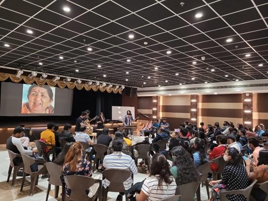 The event started at 11 am sharp with Prof. Dilip Shah, Dean of Student Affairs, calling out a speech on the contributions of Sri Lata ji, and paying her a 2-minute silence tribute with the whole audience and students. The tribute then began with the first performance of the day by Prof. Vasundhara Mishra, Department of Commerce, singing some of the classic golds of Lata ji. Some of the faculty members then joined one by one to pay the last honour to her by singing many of her songs.