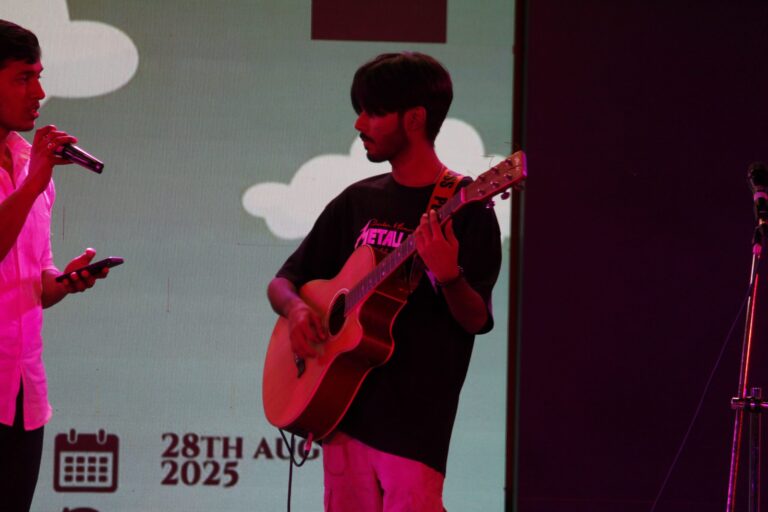 Much of the poetry was in Hindi and Urdu, with three poems in English. The poems spoke of a whirlwind of emotions attached to the monsoon – hope against hope itself, love, loss, heartbreak, the budding of new life, rejuvenation, longing, anguish, the soothing power of the season, its destructive capabilities, and emotions that had no name but could only be felt. Each emotion was explored and dissected in melodious expressions. The bond between nature and the human heart was elevated and given a stage of its own. The droplets of rain were compared to the soft touch of love that revitalises the barren land of one’s heart, and also to a blanket for the tears that follow when that land dries up and cracks once more. The closing act was presented by Vedant Gupta, the curator of the event. The audience sat through performance after performance in a reverie as they related their own experiences to the words of the poets, applauding enthusiastically after each one. The jamming session began with a round of performances by the professors on the theme of rain and monsoon, and the beautiful, devastating flood it causes in our hearts. Lata Mangeshkar’s melodious “Ghar Aaja Ghir Aaye Badra” was followed by a jolly and explosive “Barso Re”, accompanied by flashing lights and the audience beating time with their hands. Next, the Music Collective of BESC began their series of individual and duet performances by students. Songs such as “Rimjhim Gire Saawan”, “Dekhecho Ki Taake”, and “Rim Jhim Rim Jhim” took the transfixed audience on waves of upbeat as well as slow, drowsiness-inducing music, never allowing monotony to set in.