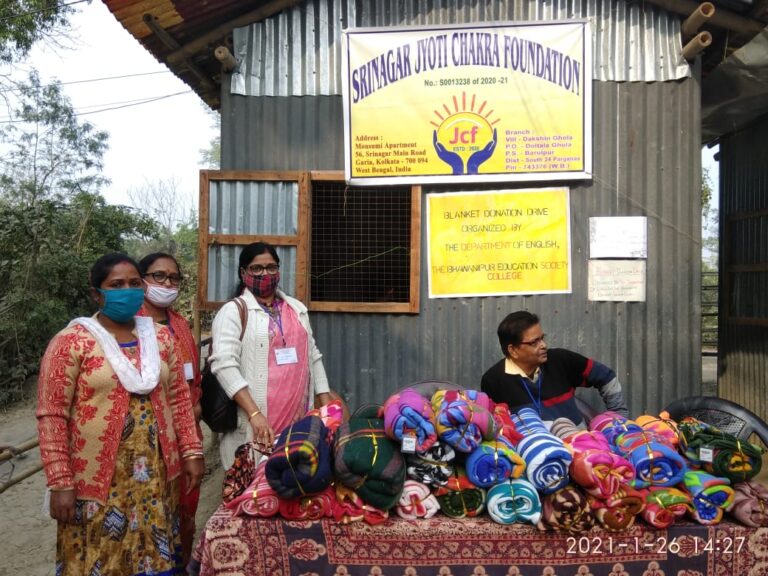 On the occasion of India’s 72nd Republic Day on January 26, 2021, a blanket donation drive was organised by the department of English of The Bhawanipur Education Society College. The UG and PG students of the department along with the faculty donated 40 blankets to Jyoti Chakra Foundation, a non-governmental organisation that primarily works for underprivileged children in Betberia, a small village near Canning, South 24 Parganas.