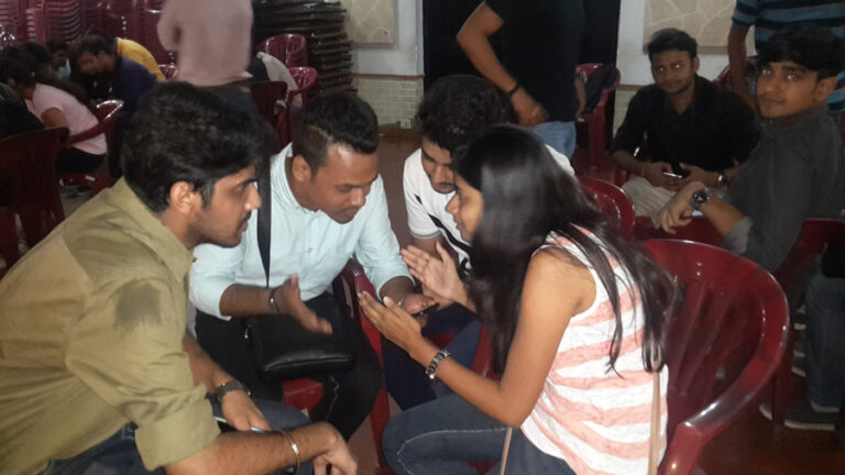 They made their way through the stairs to the fire exit but found nothing until they searched the green room where they found “ WB 06F 665……..”. Our clue finders where smart enough to understand that this was a car number. This also meant that the murderer came by a car which was still there. Detective Akhil found the car where they got their next clue “Go back to where it all started”. It all had started from the Hell which meant that their next clue was somewhere near that. Going back to where it all started was a difficult journey so one of our clue finders entered the canteen for some snacks while the others continued.