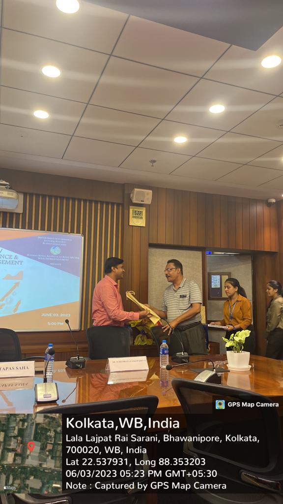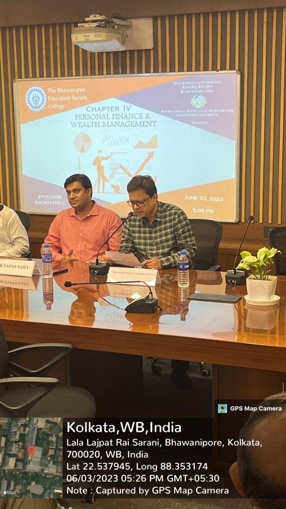 The fourth chapter of ‘Career Talks- A Series- Careers in Personal Finance & Wealth Management’ was conducted on the 3rd of June ’23 at 5pm in association with International Institute of Research & Wealth Management. The programme commenced with a welcome address by the compere of the evening, Dr Joyeta Bhadury. Thereafter the felicitation ceremony ensued wherein the two panellists, Mr Devanjan Sarkar, HR Professional & Training & Development partner, IIRWM and Mr Tapas Saha, Founder, IIRWM were presented with tokens of appreciation. Dr Subhabrata Ganguly, the Teacher – in – Charge, delivered the opening address. Mentioning how the industry offers attractive job options to those interested, Dr Ganguly made a felicitous opening setting the tone for the evening. The first speaker of the evening, Mr Devanjan Sarkar emphasized on appropriate career choice and other relevant factors that are responsible for the smooth transition from a student to a professional. Students connected readily with Mr Sarkar on accord of his lucid oration coupled with real-life examples.