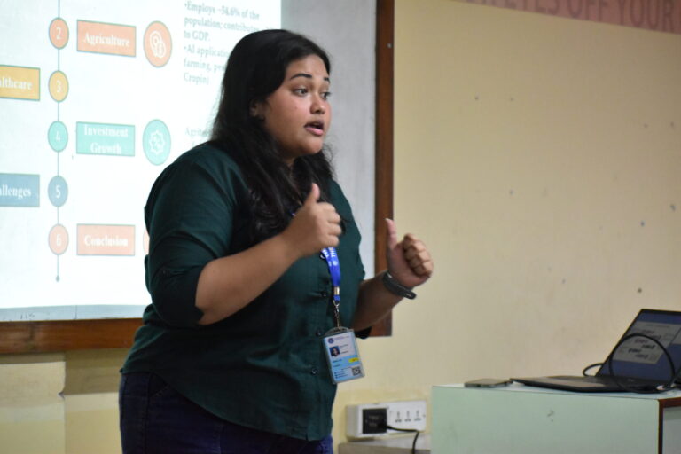 The Economics Department of the Science Section of the Bhawanipur Education Society College organized an Inter-Semester Peer Student Presentation Competition on 4th October 2024. The competition started at 3 pm and was attended by the students of Economics across all semesters. There were Four participating groups of three students from each semester, 1, 3, and 5, respectively. The groups were free to choose the topic they would have liked to present. Each group was given 12 minutes to present, and 3 minutes were dedicated to a quick Q&A Round where the judges asked the participants questions on the topic of the presentation.