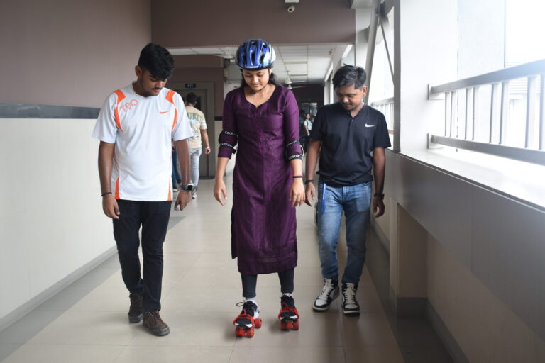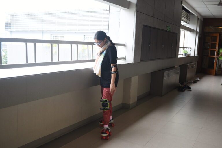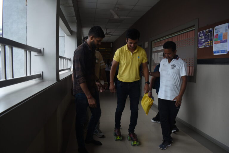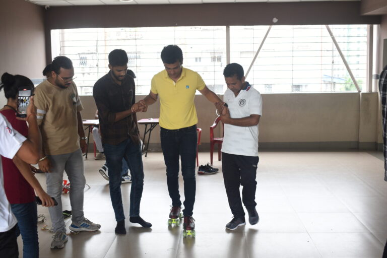 To provide the right guidance to the students, the college arranged for a fellow student, Yashvi Naygandhi, as the guide for this workshop. Participants were first introduced to the idea of skating and how skate shoes work. Following the introduction, they were asked to strap on the skate shoes and take slow careful steps while focusing on maintaining balance. The next step was to hold the railings and slowly glide in the skates while also learning how to stop. As the participants gained more confidence, it was time for them to skate without any support under the vigilance of the assigned volunteer. The number of students in the first batch was comparatively lower than the number of students in the second batch as many people registered on the spot with the motive of trying out a new activity.