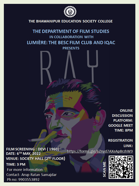 Satyajit Ray as a cultural icon needs no introduction. A multifaceted talent, he is rightly credited for putting Indian cinema on the world map. To commemorate his birth anniversary, The Department of Film Studies, in collaboration with Lumière: The BESC Film Club, and IQAC organized an event titled Celebrating RAY: Screening of Devi (1960) and Discussion, on 6th May 2022. The event was conceived to be in two parts. The first session was to comprise of a screening of Ray’s 1960 film “Devi”, held in the Society Hall in college itself from 3 pm. The second session of the event was planned as an online discussion held on Google Meet from 8 pm.