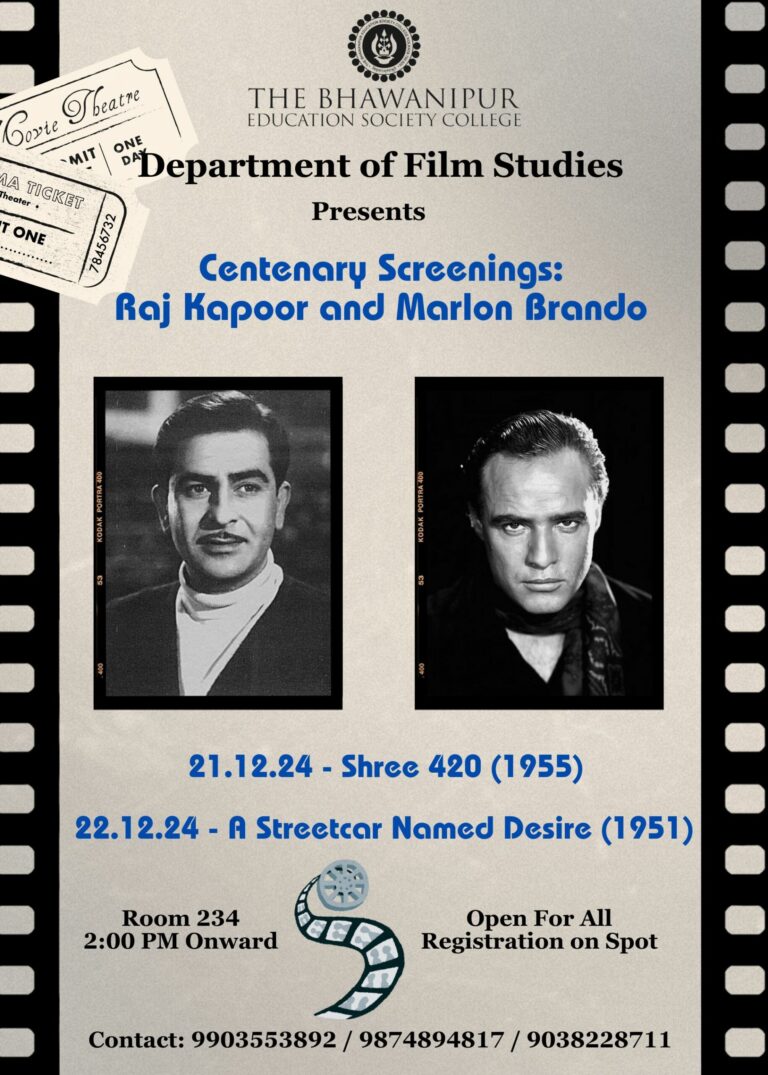 The Department of Film Studies organized back-to-back film screenings to observe the birth centenary of two legendary figures in Cinema’s history – Indian filmmaker and star Raj Kapoor and American method actor Marlon Brando. It was an occasion to revisit their work, recall their significant contribution to the medium of cinema, and importantly introduce their films to a new generation of students interested in cinema.
