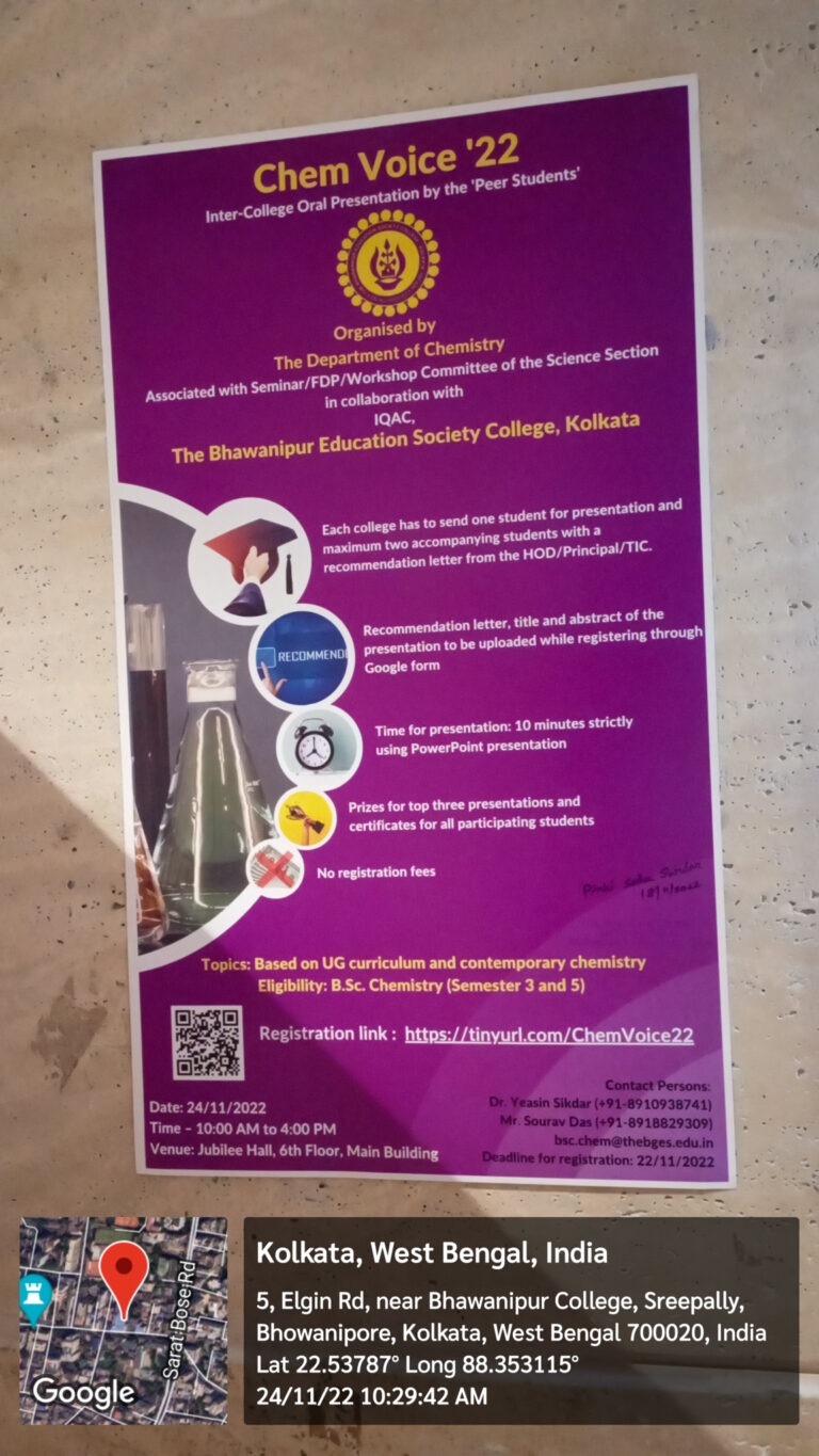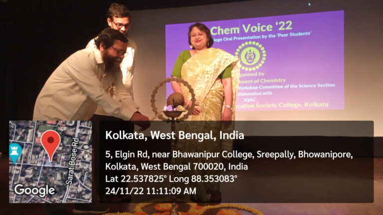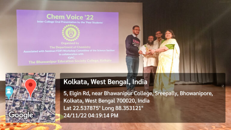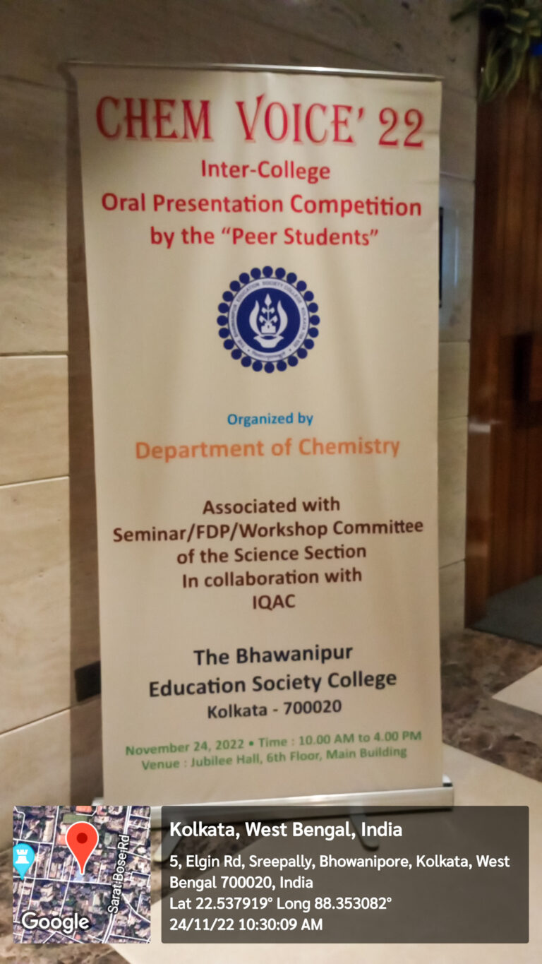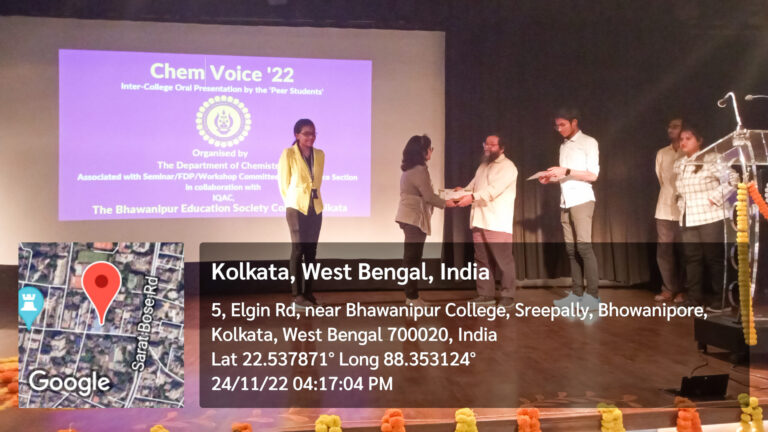 The Department of Chemistry, The Bhawanipur Education Society College organized an Inter-College Peer student oral presentation competition, Chem Voice”22 on 24th November, 2022. Students of Semester III and V, pursuing Chemistry (Hons.) from different undergraduate colleges were invited to deliver an oral presentation on any topic related to Chemistry UG curriculum and contemporary chemistry. Total 10 under-graduate colleges of the University of Calcutta participated in this competition. The Peer student’s seminar ChemVoice is a unique yearly endeavour by the Department of Chemistry, The Bhawanipur Education Society College to enhance peer-instruction, which involves students to explain topics to one another using their own words. Peer-instruction is known to promote long-term memory and provides students with insight into their level of understanding and their performance. In addition, teachers can identify student’s needs, determine how students assimilate information and indicate future learning directions. Programme started with the inaugural speech of coordinator Dr. Yeasin Sikdar followed by the welcome address of Dr. Pinki Saha Sardar, VP (Science & Admin).