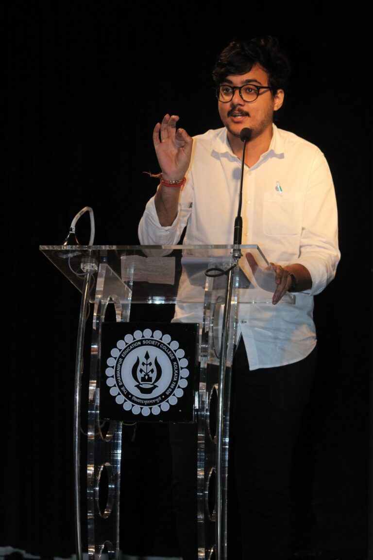 Multiverse Madness: Multiverse Madness, also known as What If, commenced from 12:00 P.M. to 1:00 P.M. in the Knowledge Adda, with twelve participants. Prof. Shabina Nishat Omar was the esteemed judge for the event. She is a professor and head at AJC Bose College, University of Calcutta, and also the recipient of the Global Educator Award. The event challenged participants to combine imagination with writing skills, where they were given four choices out of which they had to choose one to write on. The choices included “What if 3 Idiots had a tragic ending instead of a happy one?”, “What if humans could communicate directly through thoughts instead of language?”, “What if the Berlin Wall had never fallen in 1989?”, and “What if art and creativity became the primary currency?” The writings were judged based on structure, content, language, and impact, within the word limit of five hundred, written in only an hour. St. Xavier’s Autonomous College secured first position in Multiverse Madness, followed by the Bhawanipur Education Society College (Main Team) in second position, and NSHM Knowledge Campus placed third. Manifestation Centre: Manifestation Centre, popularly known as the Mock-A-Podcaster, took place from 12:00 P.M. to 2:00 P.M. in the Placement Hall of the college, and the event was judged by Mr. Jimmy Tangree, influencer, motivational TEDx speaker, and Head of 91.9 Friends FM since 2014. Each team had two members, one podcaster and one guest. Teams were given four minutes to prepare their questions and the flow of conversation, after which they had eight minutes to record their podcast interview. The event had a twist, which stated that apart from the roles assigned previously, an additional chit determined whether a participant would act as the guest or the podcaster with another college. The event was judged based on the quality of questions, improvisations, creativity of conversation, and the podcast experience. In Manifestation Centre, EICASA–Podcaster and the Bhawanipur Education Society College (Main Team)–Guest were declared winners, whereas the Bhawanipur Education Society College (OTSE Team)–Podcaster and the Bhawanipur Education Society College (OTSE Team)–Guest came second, and Seth Anandram Jaipuria College–Podcaster and Loreto College–Guest came third. Quick Silver: Quick Silver was the JAM and Verteez competition, which took place from 1:00 P.M. to 3:00 P.M. in the Society Hall of the college with fifteen participating teams. The event was judged by Parnab Mukerjee, a renowned public speaker and a published author across multiple platforms. The JAM segment consisted of two rounds with seven participants competing at a time. The moderator provided a phrase and the speaker had to talk fluently on it without hesitation, repetition, or grammatical slips, while the other participants had the right to interrupt by banging the table to point out a mistake. If the objection was correct, the challenger scored a point; otherwise, one point was deducted. It took place in two different rounds, and every round had two topics for the speakers. For Round One, the topics were “Sachin prefers leg before wicket in cricket” and “I wear glasses but I hardly have vision.” “The sky is partially outcast” and “The clock is perpetually stuck at 12 because it’s noon all the time” were the topics for Round Two. The segment of Verteez included only a single round where each team was given ninety seconds to guess a word the moderator had in mind by asking “Yes” or “No” questions. If the team failed to deduce the answer within the time limit, the question was passed on to the next team. Quick Silver witnessed the Bhawanipur Education Society College (OTSE Team) as the winner, Goenka College of Commerce and Business Administration in second position, and The Bhawanipur Education Society College (Main Team) in third position. The Best Jammer award was handed over to Seth Anandram Jaipuria College. Alchemist’s Eye: Alchemist’s Eye, the Literary Interpretation, took place from 1:00 P.M. to 2:00 P.M. in the Knowledge Adda, with twelve participants and was once again judged by Prof. Shabina Nishat Omar. At the start of the event, a poem was given to all participants, and within an hour, they had to write a critical appreciation on the sheets provided, within two hundred and fifty to three hundred and fifty words, analysing the poem’s meaning, tone, and imagery, without the use of any electronic device. In addition, each participant had to compose a four-line original verse inspired by the poem. In Alchemist’s Eye, the Bhawanipur Education Society College (OTSE Team) was declared the winner, Scottish Church College (Main Team) came second, and Seth Anandram Jaipuria College came third. The Spoken Spell: The Spoken Spell was the Mushayra event, which took place from 2:00 P.M. to 4:00 P.M. in the Placement Hall of the college and was judged by Mr. Anubraata Bandyopadhyay, a versatile Urdu poet with two published volumes, a performer, and a visual artist. The event had two rounds, where in the first round, each participant was given two minutes to recite a shayari or nazm, out of which the selected participants qualified for the second round. In Round Two, the judge gave random words like “falsafa” and “aankhein” to the respective participants, and they had to create an original shayari on the spot using the given word without the use of any literary aid. The Bhawanipur Education Society College (Main Team) bagged first place in The Spoken Spell, the Bhawanipur Education Society College (OTSE Team) took second place, and MCKV secured third place.