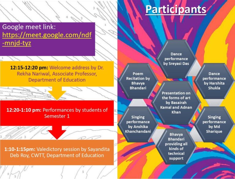 A cultural programme was organized by the Department of Education on the 2nd of February 2022. The current pandemic has been a bane for all of us, but it could not dampen the spirit of the Semester 1 students to showcase their talents. Even though the event was held virtually, everything went off without a hitch on Google Meet. The welcome address was delivered by Dr. Rekha Nariwal, Associate Professor, Department of Education. Dr Nariwal sang a few lines of the Saraswati Vandana and gave a melodious kickstart to the event. Harshita Shukla appeared as the anchor, while Bhavya Bhandari provided technical assistance and acted as the event’s screen presenter. The very first performance was done by Sreyasi Das. She danced gracefully in Bharatnatyam on the song Yadhi Mahi. Next, we had Anshika Khanchandani swooning us with her sweet voice singing Hansi Bann Gaye from the movie Humari Adhuri Kahani. Basairah Kamal and Adnan Khan presented the various Art froms of India by preparing an eye catchy slideshow. They meticulously pointed out the well-known art forms like Madhubani painting, Kalamkari, Tanjore painting and many more. Md Sharique Alam sang the title track of Raabta. Harshita Shukla danced quite energetically on the song Ajaa Nachle while Sreyasi Das managed the anchoring part for a while. Lastly, we had with us Bhavya Bhandari who composed and recited a beautiful poem titled ‘It is just a matter of smile’. She expressed the idea that no matter what happens in our life, we must gracefully keep a smile and move on. Finally, Sayandita Deb Roy, CWTT, Department of Education sang a few lines from the Rabindra sangeet Jagorone Jaaye Bibhabhori and offered the Vote of Thanks on behalf of the Department of Education, expressing her deepest gratitude to the participants, and the respected teachers from the Arts Department who graced the occasion with their presence and made it a memorable one.