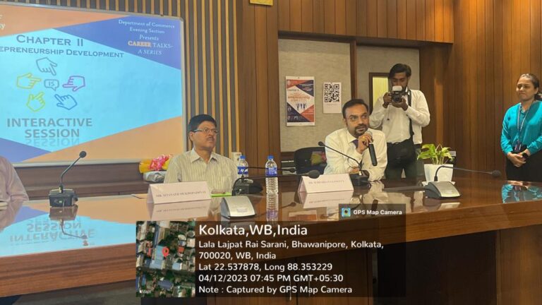 The second chapter of ‘Career Talks- A Series-Entrepreneurship Development’ saw a packed second floor auditorium on the 12th of April ’23 at 5:30pm. The programme commenced with a welcome address by the compere of the evening and the coordinator of the Student Activities Committee, Ms Arundhati Mazumder. Thereafter the felicitation ceremony was conducted wherein the two eminent speakers, Mr Sitanath Mukhopadhyay, Assistant Director, IEDS Cadre, Ministry of MSME, Government of India and Mr Aliv Banerjee, Assistant Professor, Meghnand Saha Institute of Technology, Entrepreneurship Educator and Startup Mentor were presented with tokens of appreciation.