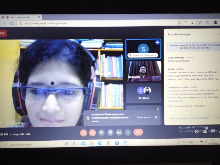 The sixth chapter of the departmental Peer Webinar was organized by the Department of English, The Bhawanipur Education Society College on 22.04.2022 from 7.00 p.m. In this session, Dr. Gargi Talapatra, Assistant Professor, Department of English, delivered a presentation entitled “Khoob Ladi Mardaani: The Enigmatic Life of a Subalternized Queen”. A critic, creative writer and translator, Dr. Talapatra’s works have been published in various academic journals and books of repute. Some of her recent publications include ‘The Tempest: Through the lens of Natya Shastra’ – an article published in Kalakalpa, the Journal of Arts published by the Indira Gandhi National Centre for the Arts in 2019 and ‘William Faulkner: The Sound and the Fury’ – an article published in a book entitled The American Novel from Hawthorne to Heller: Cultural Contexts and Critical Perspectives by MacMillan India Pvt Ltd in 2020. Her areas of research interest include Indian literatures, postcolonial literature, gender studies, subaltern studies and cultural studies.