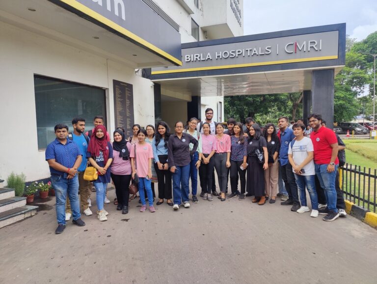 The students from different departments of the Bhawanipur Education Society College were taken to CMRI (The Calcutta Medical Research Institute) Hospital for an Educational visit on 6th July 2023. The students assembled near the Turf area accompanied by the two faculty in-charge, Mr. Subhasish Dasgupta and Mr. Souvik Mazumder. There were around thirty students, and they left the college around 9:30 am by bus, which reached the hospital by 10:30 am.
