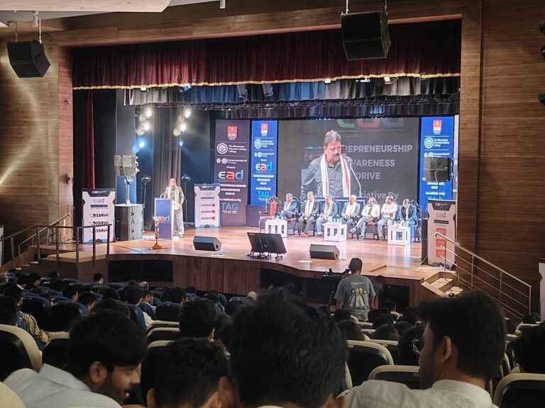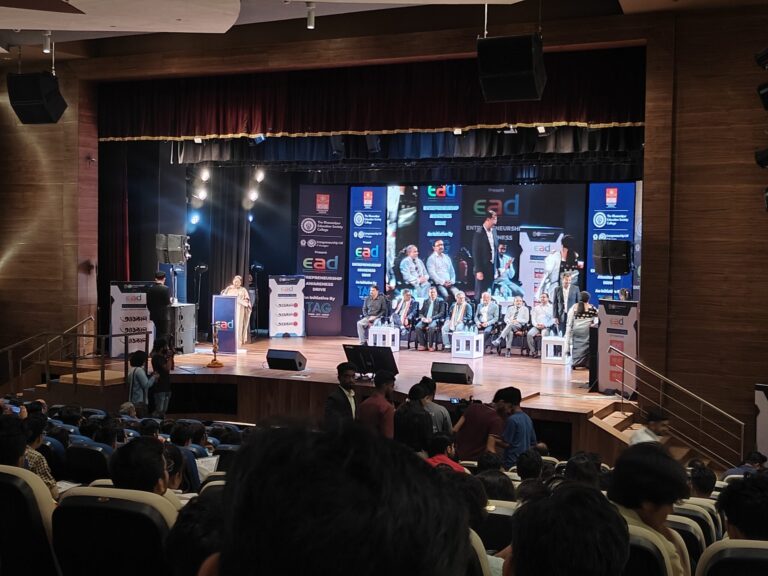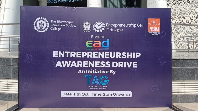 The Bhawanipur Education Society College in collaboration with IIT Kharagpur and NSHM Knowledge Campus organized Entrepreneurship Awareness Drive (EAD) on 11th October, 2023 from 2:00 pm. to 7:00 pm. at Dhono Dhanyo Auditorium, Kolkata. The event started with a magnificent inaugural ceremony which included inviting the guests on to the dice and lighting of the lamp done by Prof. Soujanya Pudi, Professor and Head CLC, NSHM, and Prof. Nabaneeta Dutta, Assistant Professor, NSHM Business School. The inaugural ceremony also included an inaugural song and the felicitation of the guests. This was followed by a Welcome Address by Mr. Cecil Antony, Chief Mentor, NSHM Knowledge Campus. Continuing this, Prof. Dilip Shah, Rector and dean of Student affairs, The Bhawanipur Education Society College enlightened young minds with the importance of EAD-2023. Dr. Soumendra Nath Bandyopadhyay, Professor and In-Charge of TAG Re-Launched TAG, and this was followed by an Alumni Speech by Mr. Tamal Saha, Journalist, NTT.