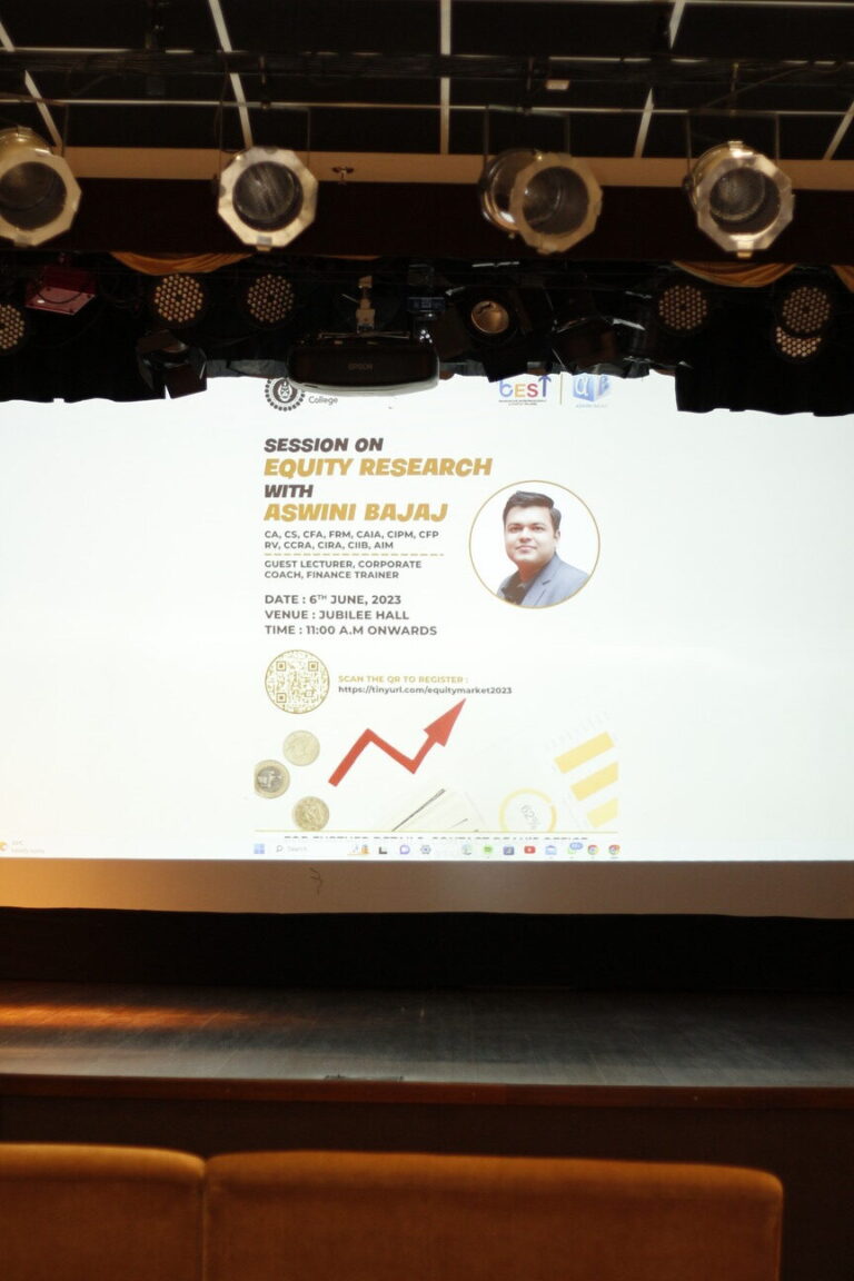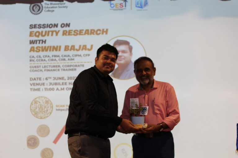 The BEST collective of the Bhawanipur Education Society College organized an informative session on equity research, led by the esteemed speaker Mr.  Aswini Bajaj. The session, held on the 6th of June, took place at the Jubilee Hall, and drew an impressive attendance of over 250 students. The primary objective of the event was to provide attendees with a profound understanding of how expert equity researchers analyze companies for investment purposes. The event commenced with an introductory speech by Prof. Dilip Shah, Dean of Student Affairs, who also felicitated the distinguished speaker, Mr. Aswini Bajaj.