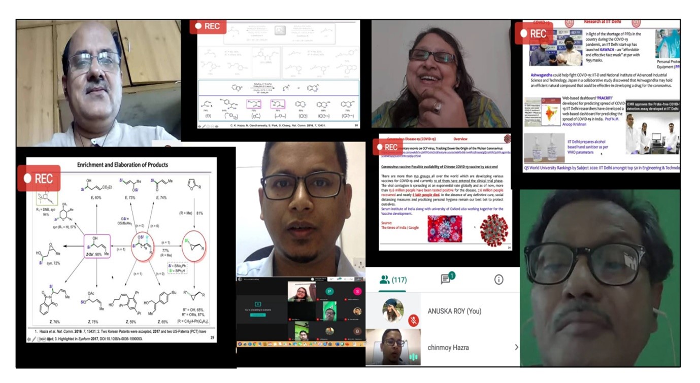 The technical session was covered by our resource person Dr. Chinmoy Kumar Hazra from Department of Chemistry, Indian Institute of Technology Delhi, India. The distinguished resource person enriched all with the four modern topics of interest. The first part of the webinar highlighted the catalytic generation of silicon based copper-(I) reagents from silicon pronucleophiles and the synthetic application of the methodologies and the synthesis of new materials. The second part of the talk was focused on the development of a mild and robust direct C–H functionalization strategy to the synthesis of axially chiral biaryls at ambient temperature with catalytic amount of Pd(OAc)2. The third part of the talk consisted of metal-free processes. In this part, a facile transformation of furans into silicon functionalized synthetic intermediates, by tris(pentafluorophenyl)borane-catalyzed cascade hydrosilylation processes under transition metal-free conditions were discussed. The last part of the talk was on COVID-19 related issues and the related inventions made by the various reputed institutions of India to fight against this particular disease.