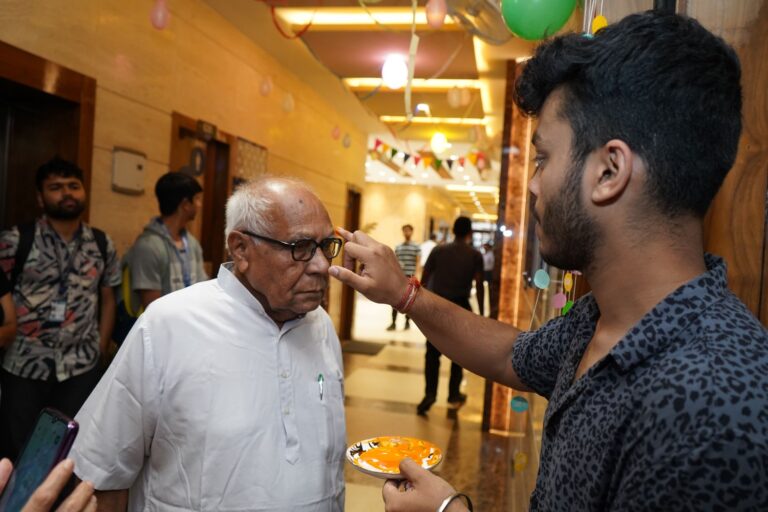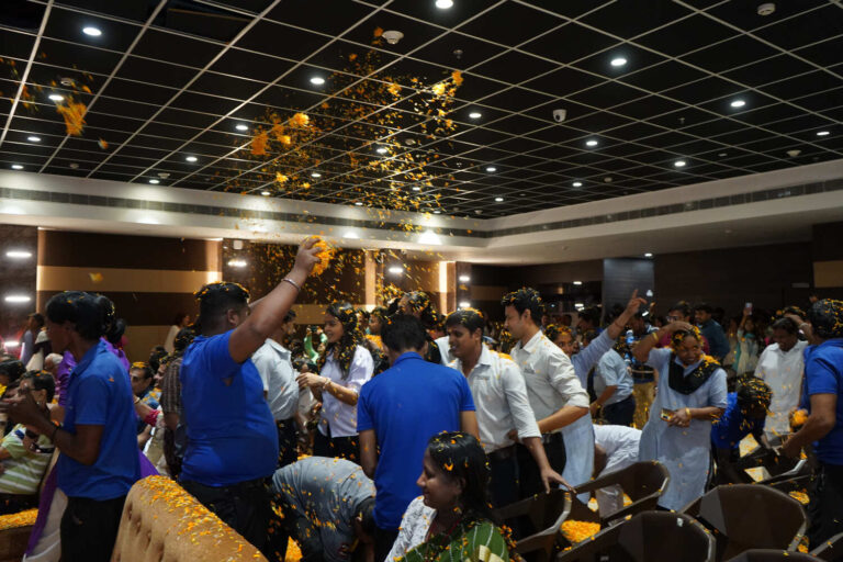 Towards the end, the event concluded with floral showers on the attendees, as each present at the venue played a floral holi & moved towards the Inner space. At Inner Space volunteers were ready to distribute gifts & food coupons to the Non-Teaching staff who then proceeded to the Canteen to savour some delicacies with a chilled Thandai to beat the summers ahead of spring.