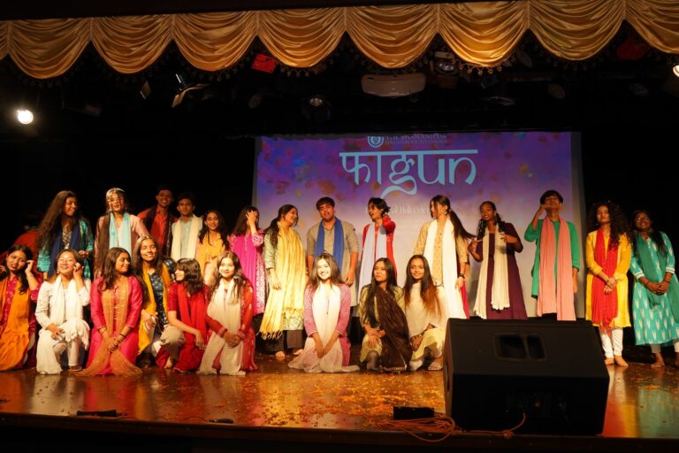 The event proceeded further with Ms. Rekha Narewal welcoming the festival of spring with her songs on Holi. The audience was thereafter entertained with KBC-themed riddles, which when answered correctly were given chocolates. This was followed by a Stand-up performance by one of our students, SK Saquib Saeed who entertained the audience with his humour. Soon after the Enact team of the college put up an enticing show of ‘lathmar’ holi from the towns of Barsana & Nandgaon. The festival of colours was the theme of the act & was an absolute thrill to witness in a musical & theatrical streak. To conclude the day’s festivities the Flames Western & Bollywood team gave the audience a chance to sing & dance along with joyful Bollywood numbers to groove on.