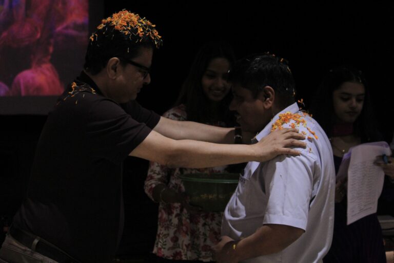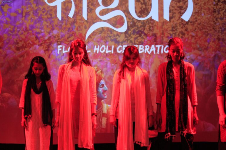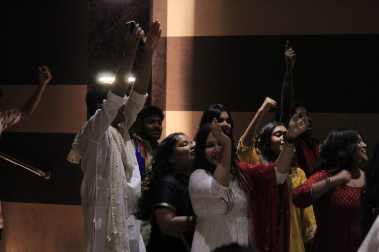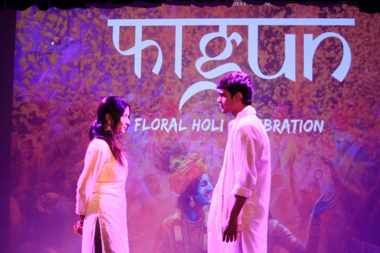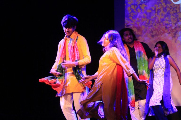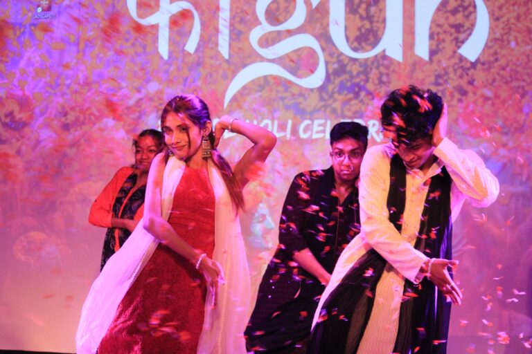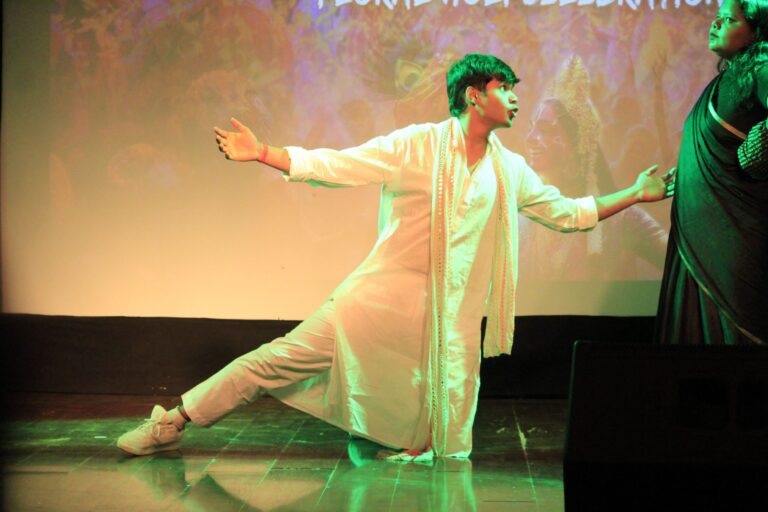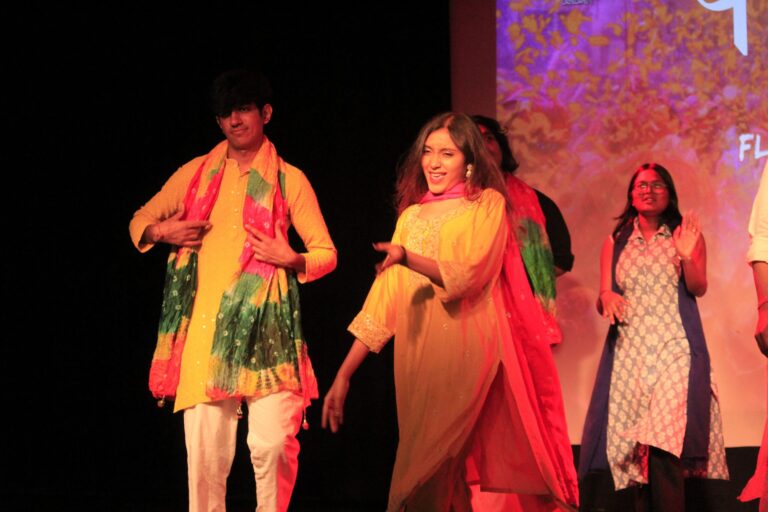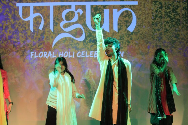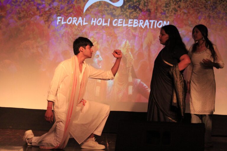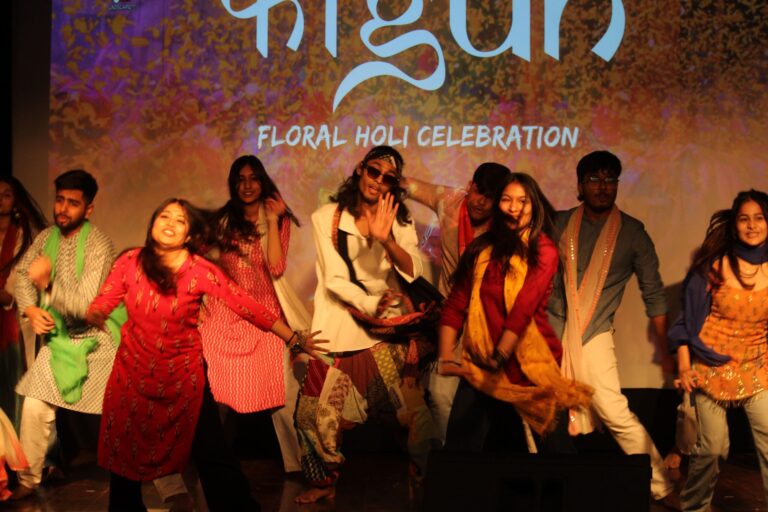 The event was kickstarted by members of the Crescendo Collective, who presented beautiful Hindi and Bengali renditions of songs capturing the essence of Holi encouraging the audience to sing along. Soon after, the Rector and Dean of Student Affairs, Prof. Dilip Shah, addressed the audience and acknowledged that the non-teaching staff are the institution’s backbone and unsung heroes without whom the college would not prosper or sustain itself. He took to the stage and invited non-teaching staff members in two rounds to felicitate them with a token of appreciation. The audience was further entertained by Aarohan, a team from the Enact Collective, who performed a playful skit that included lively dance performances to some of the most-loved Holi songs. The enthusiasm was infectious, as the audience couldn’t help but rise from their seats to join in and dance along. Adding another layer of fun, a retro Bollywood game had the audience guessing famous songs from just a tune, making them nostalgic for simpler times. Finally, the Western and Eastern teams of the Flames Collective concluded the event with spectacular dance performances that brought the spirit of Holi to life. Towards the end, student volunteers and guests came together to play “Phoolon Ki Holi”, joyfully tossing flower petals in the air and dancing tirelessly.