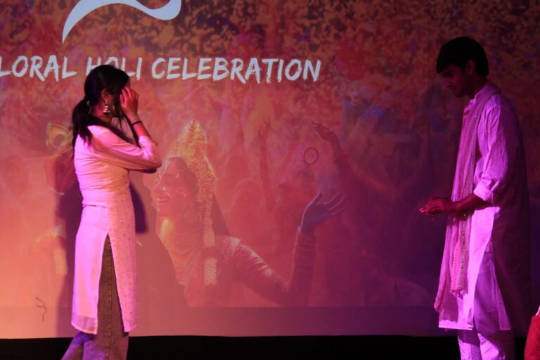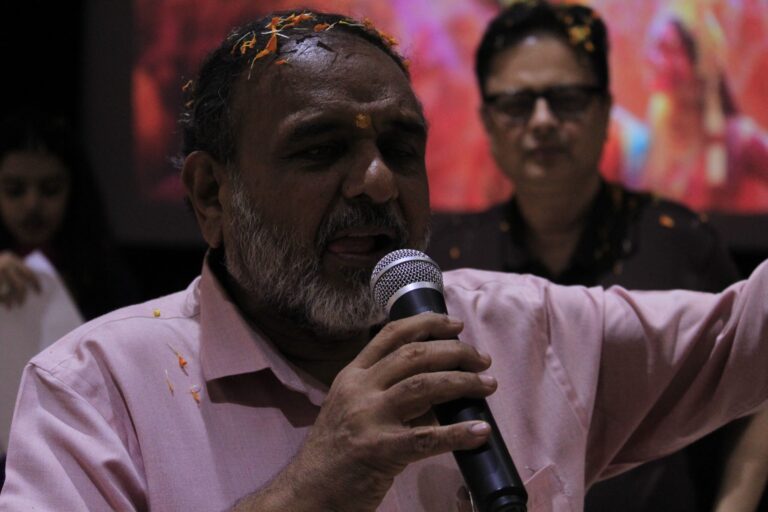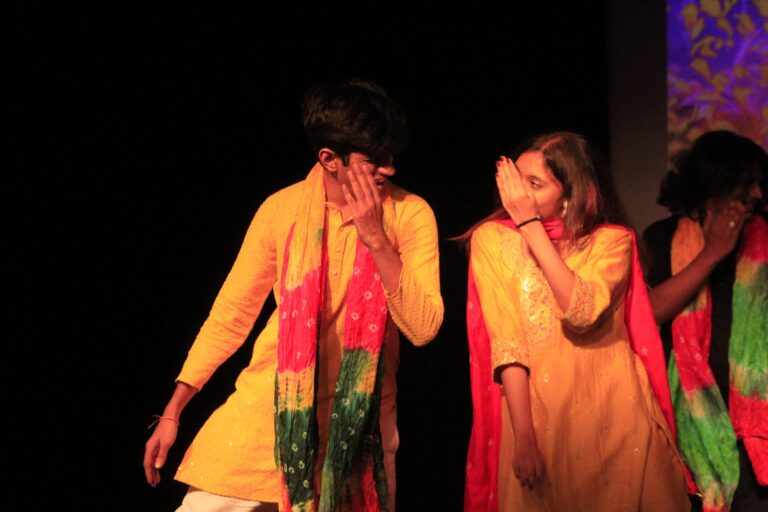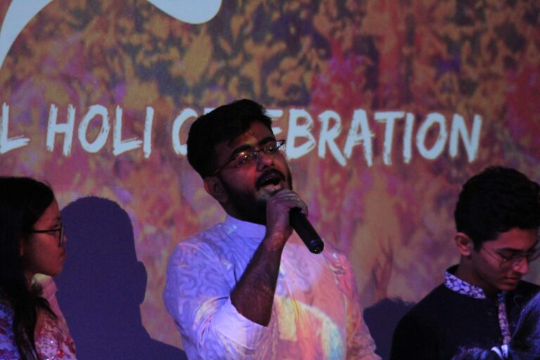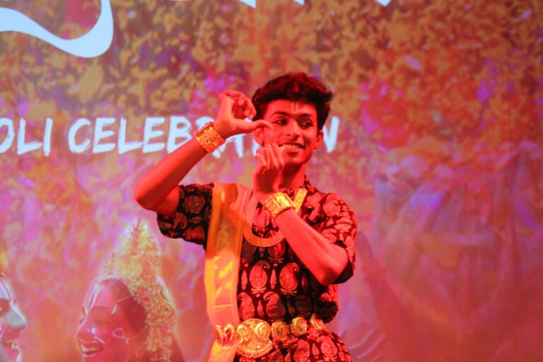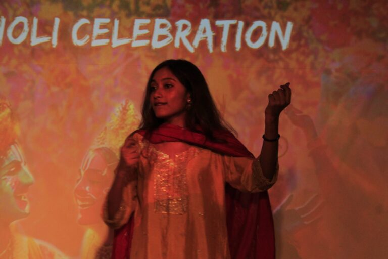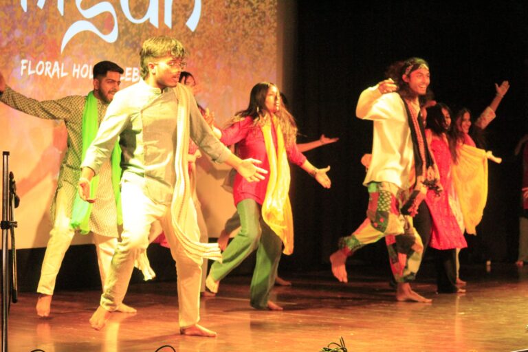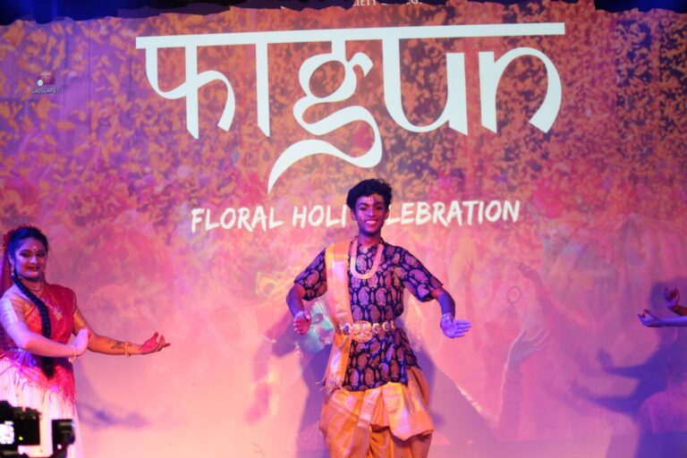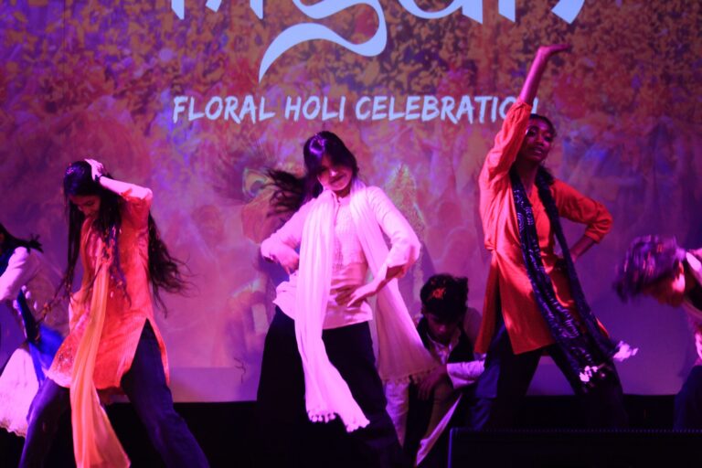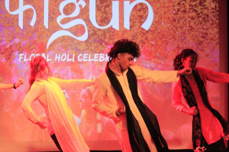 The event was kickstarted by members of the Crescendo Collective, who presented beautiful Hindi and Bengali renditions of songs capturing the essence of Holi encouraging the audience to sing along. Soon after, the Rector and Dean of Student Affairs, Prof. Dilip Shah, addressed the audience and acknowledged that the non-teaching staff are the institution’s backbone and unsung heroes without whom the college would not prosper or sustain itself. He took to the stage and invited non-teaching staff members in two rounds to felicitate them with a token of appreciation. The audience was further entertained by Aarohan, a team from the Enact Collective, who performed a playful skit that included lively dance performances to some of the most-loved Holi songs. The enthusiasm was infectious, as the audience couldn’t help but rise from their seats to join in and dance along. Adding another layer of fun, a retro Bollywood game had the audience guessing famous songs from just a tune, making them nostalgic for simpler times. Finally, the Western and Eastern teams of the Flames Collective concluded the event with spectacular dance performances that brought the spirit of Holi to life. Towards the end, student volunteers and guests came together to play “Phoolon Ki Holi”, joyfully tossing flower petals in the air and dancing tirelessly.