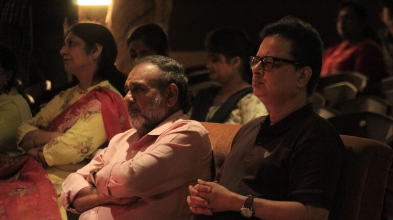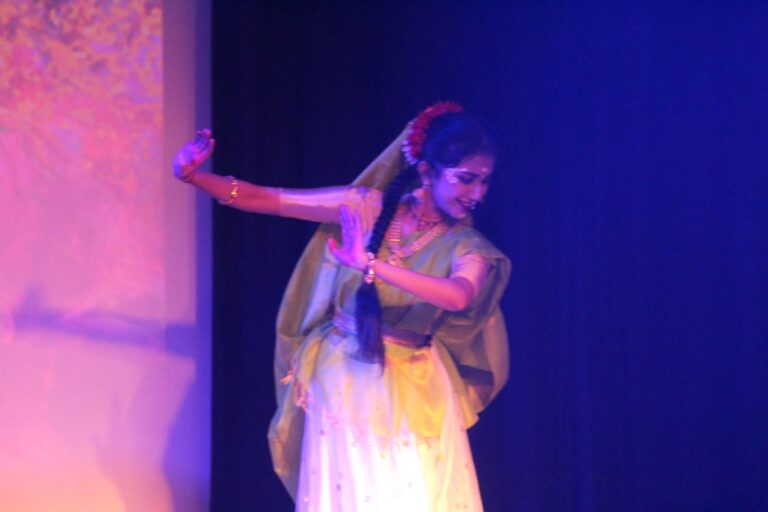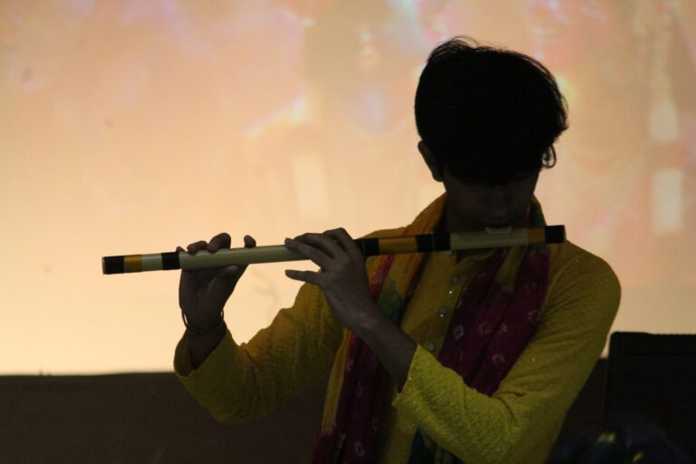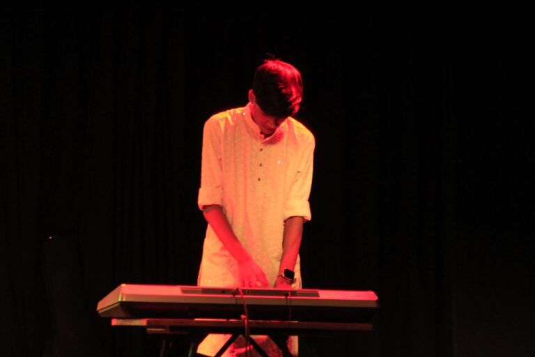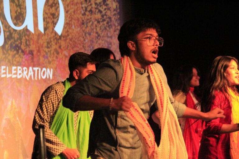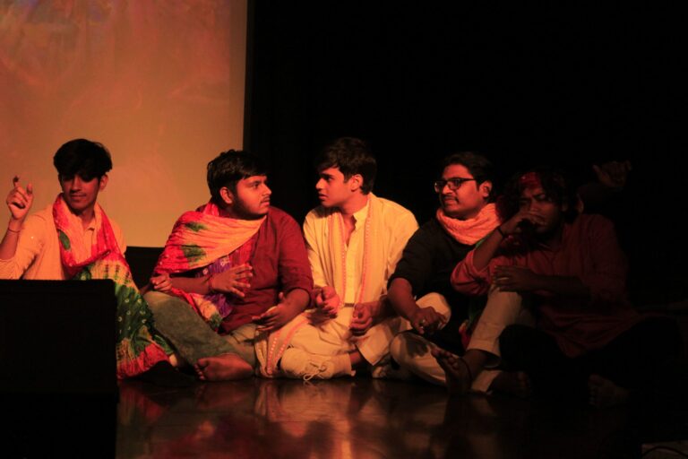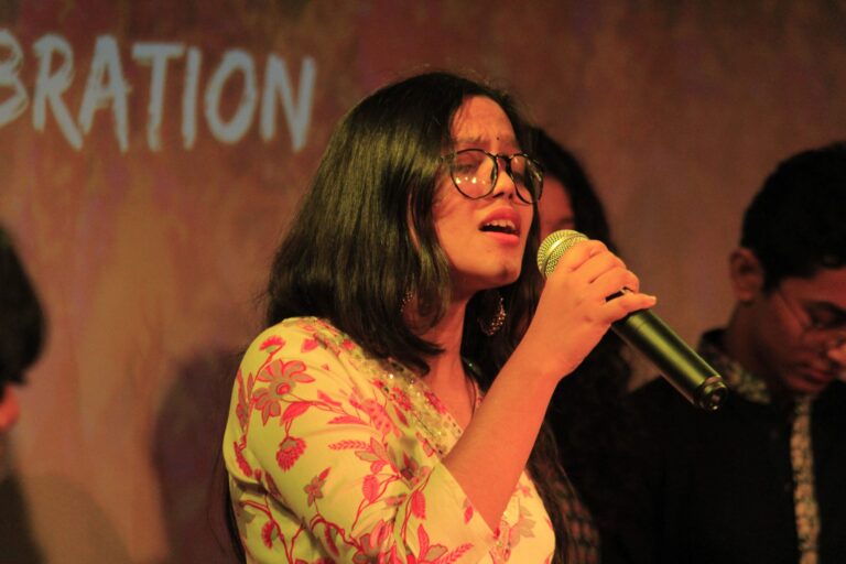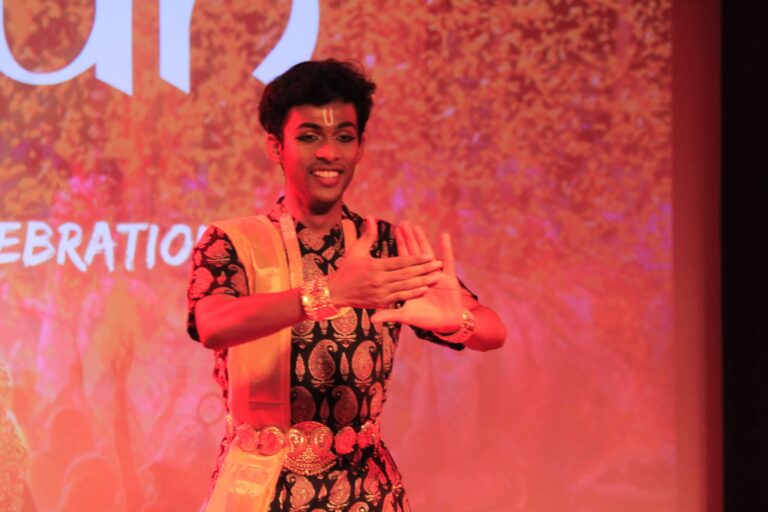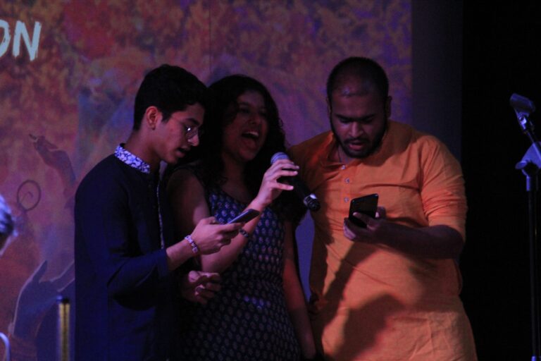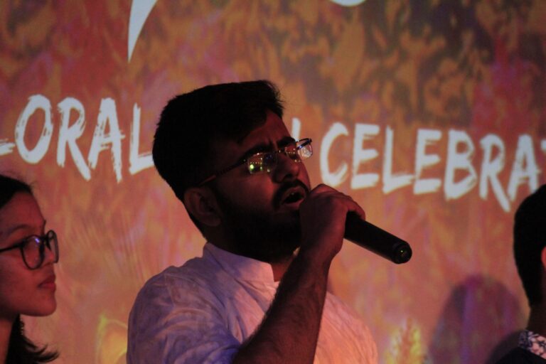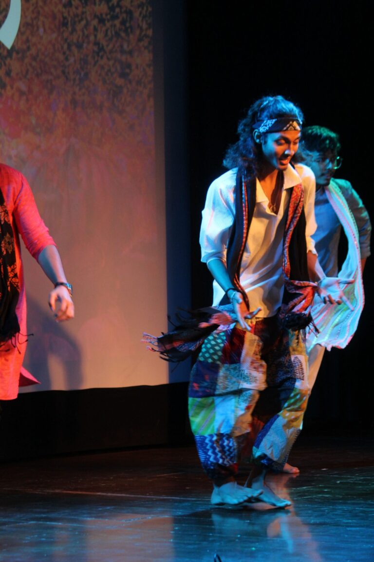 The event was kickstarted by members of the Crescendo Collective, who presented beautiful Hindi and Bengali renditions of songs capturing the essence of Holi encouraging the audience to sing along. Soon after, the Rector and Dean of Student Affairs, Prof. Dilip Shah, addressed the audience and acknowledged that the non-teaching staff are the institution’s backbone and unsung heroes without whom the college would not prosper or sustain itself. He took to the stage and invited non-teaching staff members in two rounds to felicitate them with a token of appreciation. The audience was further entertained by Aarohan, a team from the Enact Collective, who performed a playful skit that included lively dance performances to some of the most-loved Holi songs. The enthusiasm was infectious, as the audience couldn’t help but rise from their seats to join in and dance along. Adding another layer of fun, a retro Bollywood game had the audience guessing famous songs from just a tune, making them nostalgic for simpler times. Finally, the Western and Eastern teams of the Flames Collective concluded the event with spectacular dance performances that brought the spirit of Holi to life. Towards the end, student volunteers and guests came together to play “Phoolon Ki Holi”, joyfully tossing flower petals in the air and dancing tirelessly.
