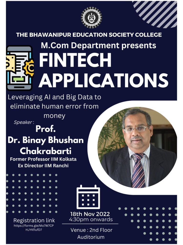 A seminar on Fintech Applications was organized by the Department of Postgraduate Commerce at The Bhawanipur Education Society College. The distinguished speaker for the seminar was Prof. Dr. Binay Bhushan Charabarti, former professor at the Indian Institute of Management Calcutta, and former Director-in-Charge at IIM Ranchi. Commencing at 4:30 p.m., the seminar began with an opening address by Ms. Dipannita Chatterjee.