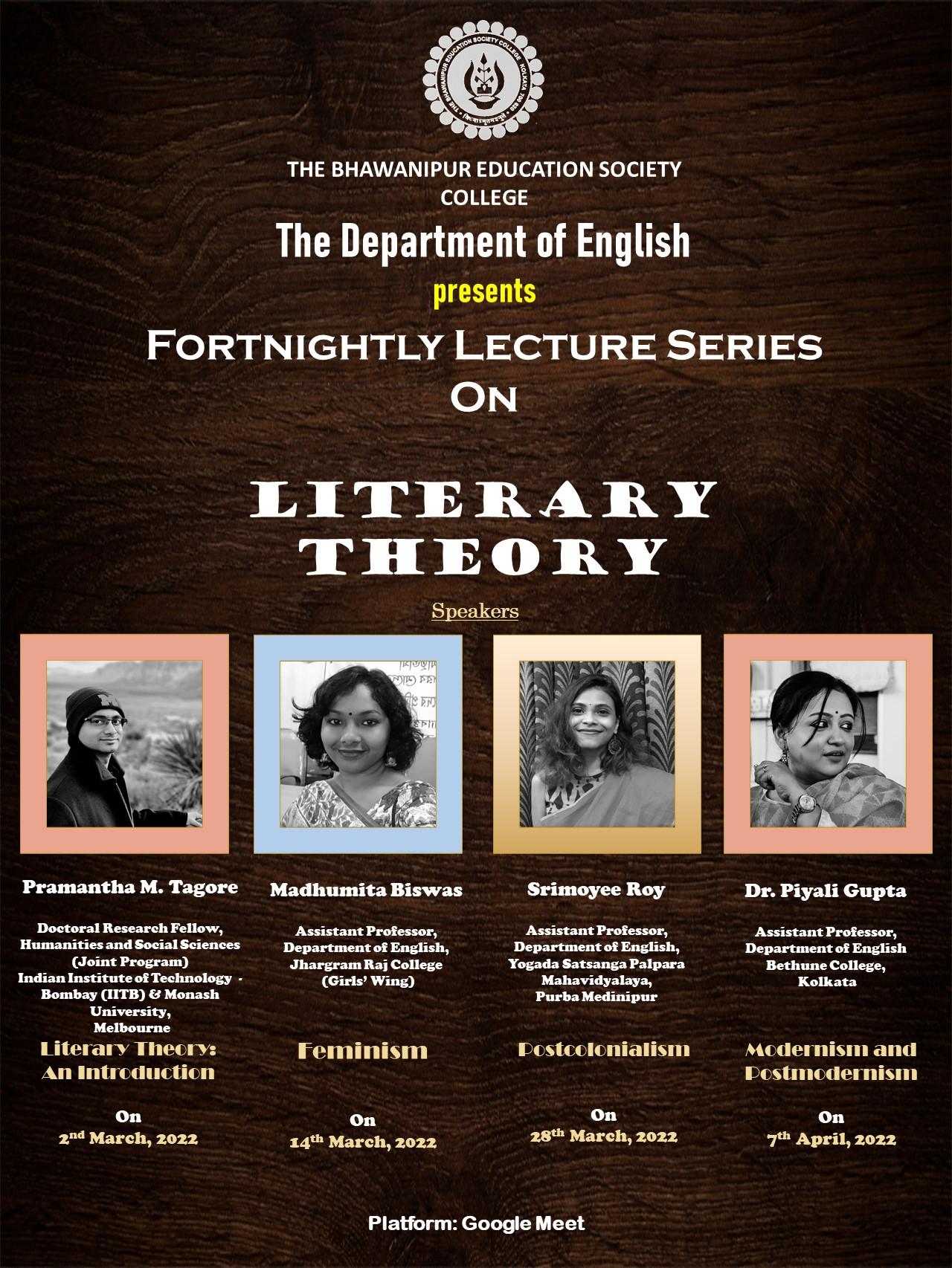 The Department of English organized a series of Fortnightly Lectures on Literary Theory for the final semester students of the Undergraduate and the Postgraduate courses, in March-April 2022. This was planned to ensure that the students are equipped with advanced knowledge of literary theory and criticism as several of them would, after their final semester, be appearing for entrance examinations for M.A and also conducting research.