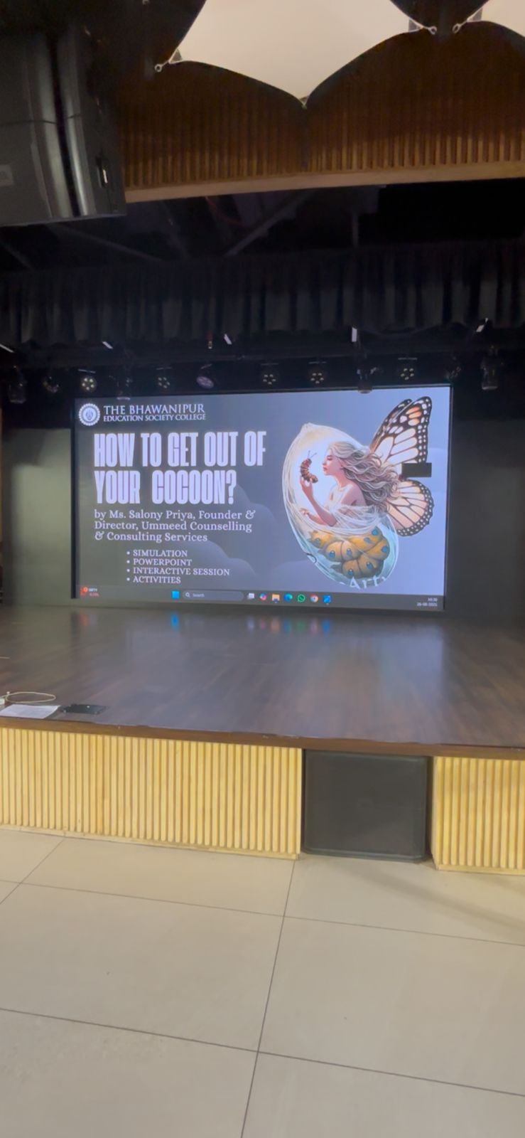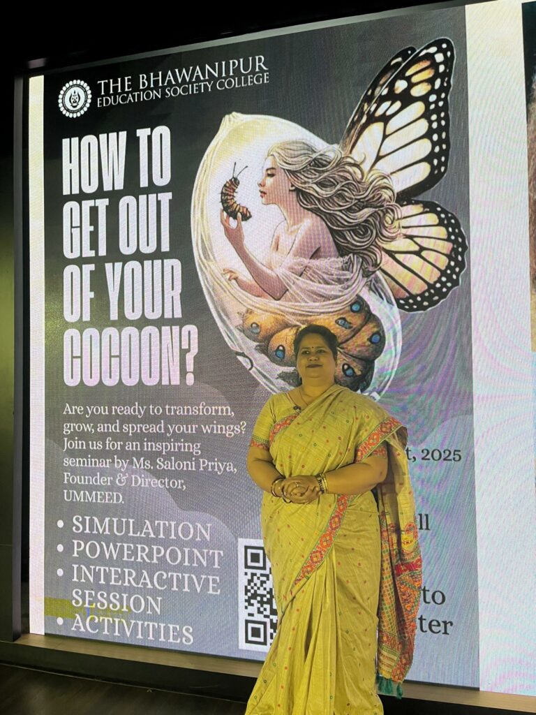 The seminar titled “How To Get Out Of Your Cocoon” was conducted on 26th August 2025, at the Concept Hall of the Bhawanipur Education Society College, by Ms. Salony Priya, a distinguished counselling psychologist and the Founder-Director of Ummeed Counselling and Consulting Services. The event lasted for two hours, starting at 11:00 A.M. and continuing until 1:00 P.M. It was graced by the Rector and Dean of Student Affairs, Prof. Dilip Shah, who inaugurated the session with inspiring words and felicitated Ms. Salony Priya. The seminar aimed to help students transcend self-imposed limitations, recognise the significance of mental health, and foster interpersonal growth alongside academic pursuits. Ms. Salony Priya articulated that the “Life of a Cocoon” symbolises our self-imposed boundaries, and she asserted, “When we break out of our shell, that’s when we truly live.” She then explained to the audience “the value of knowledge over marks”, emphasising that academic grades are not the sole indicators of success; rather, knowledge, skills, and self-awareness are the true determinants of an individual’s development. Books and conscious choices shape individuals into what they aspire to become. Her next point of discussion was “breaking conditioning and self-reflection”, where participants were encouraged to overcome societal conditioning and dilemmas tangled within the loop of self-doubt. “SWOT Analysis” was introduced to the students, where they were instructed to pen down their Strengths (hobbies, preferences, and optimism), Weaknesses (areas requiring improvement, fears, and detrimental habits), Opportunities (resources, financial means, goals, and external support), and Threats (reality checks, obstacles, parental expectations, and societal pressures). In the words of Ms. Salony Priya, in an era dominated by AI and technology, communication skills are indispensable. She emphasised the relevance of psychology in various domains, including MBA programmes, therapy, and life coaching, elucidating misconceptions regarding mental health and explaining the etymology of the term “Psyche”, which is derived from the Latin word “Psycho”, meaning “Mind” or “Brain.”
