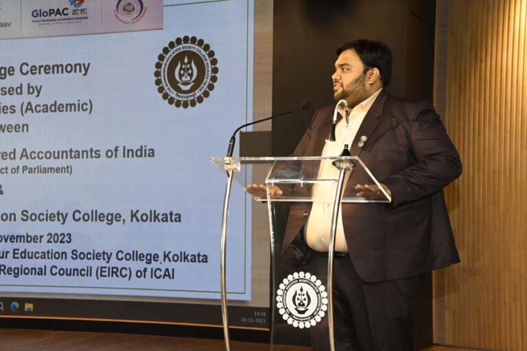 The Bhawanipur Education Society College organized a MoU signing ceremony with the Institute of Chartered Accountants (ICAI) The BESC on 1st November 2023 which was a historic day for the college. CA Vishal Doshi, Chairman Board of Academic Studies (ICAI); CA Sushil Kumar – Member Central Council; CA Debanjan Patra – Chairman EIRC; CA VK Tulsyan – Secretary EIRC & CA Mayur Agarwal – Treasurer EIRC graced the occasion with their presence. The program was inaugurated by the Rector and Dean of Student Affairs Prof. Dilip Shah, TIC along with CA Vishal Doshi, CA Sushil Kumar Goyal, CA Debayan Patra CA Vishnu Kumar Tulsyan, CA Mayur Aggarwal. Dr. Subhabrata Gangopadhyay, Dr. Pinky Saha Sardar, Prof. Saspo Chakraborty, Prof. Meenakshi Chaturvedi were inaugurated by lighting the lamp. TCA Vishal Doshi was honored by college TIC Dr. Subhabrata Gangopadhyay with a memento and a memento. All the special guests were welcomed.
