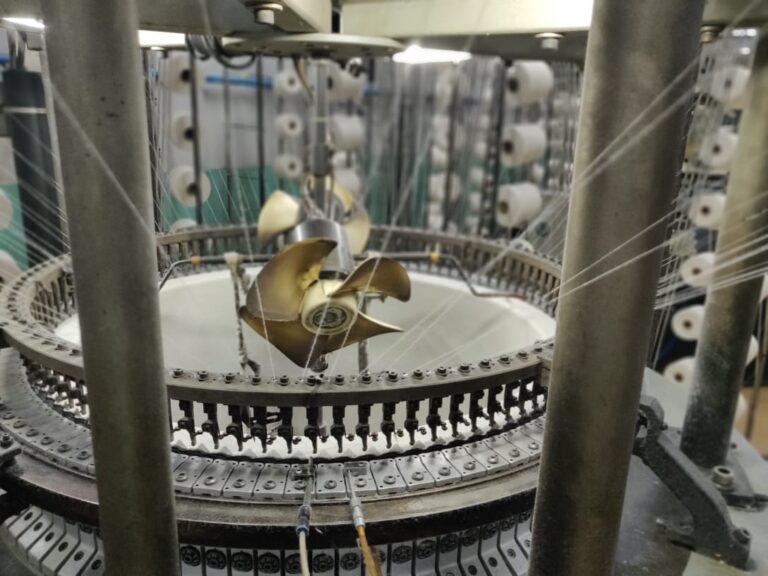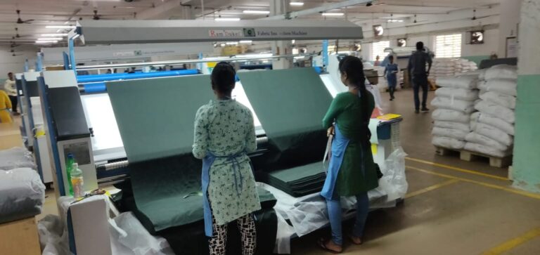 The first process is known as Knitting, where the thread is knitted to produce the cloth that is to be used as raw materials in the next process. Several large machines spin the thread to be knitted into yard of white cloth. This clothes are then stored in lots of 200 kg each. These lots are then taken for inspection by men, who inspect the clothes thoroughly for any defects, stains, tear, etc. The inspected clothes are then taken to be dyed.