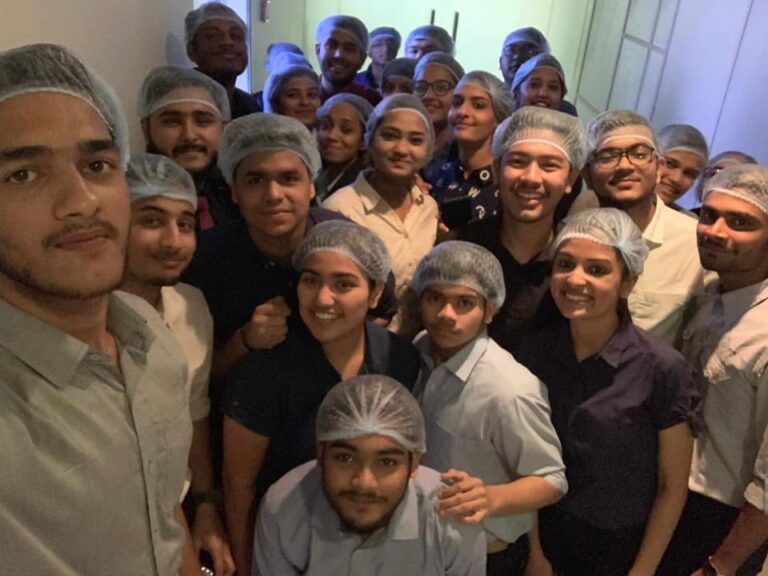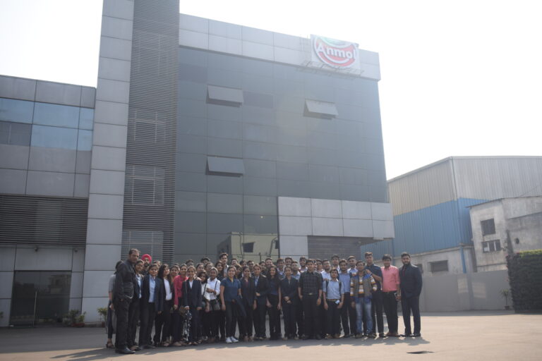 The students were taken for a tour to the production facility to provide a more practical understanding. As the plant follows a strict hygiene rules all the students were provided with headgears which would prevent the products from being contaminated. The students were also told not to touch any raw material, dough or machinery as it could lead to contamination, injuries or malfunctions. The students were guided into the plant by Mr. Anil Bose, Production Manager. The students were taken to the section of the plant where the dry and wet ingredients such as flour, sugar cream, etc. are mixed in automated mixing machines worth Rs. 80,000 to prepare the perfect dough for the biscuits. The machines as automated, the batter once made is rolled into thin sheets and transported to the other department through conveyers, thus avoid human touch and maintaining hygiene. The rolled sheets are passed through a machine which automatically cuts the sheets into perfectly sized biscuits. The biscuits are then passed through a long oven which has 5 different zones, each zone is heated to different temperature, which bakes the product to crisp perfectly. The freshly baked biscuits are then sent to the lower level where a modern packaging machine worth Rs 12 lakh helps in easy and fast packaging of the freshly baked products. The packets of biscuits are then filled in cartoon and sent to the warehouse from where it is distributed all over India. Anmol Biscuits even export their products to eastern Africa and South American countries. As the biscuits were being packed there were many biscuits which broke in the course and thus could not be packed and marketed to the consumers, these biscuits which lead to wastages in the production process were separated by the workers. The production manager told the students that there is maximum 2% wastage in the whole production process and most of this wastage is reprocessed as dust and mixed in new batch.