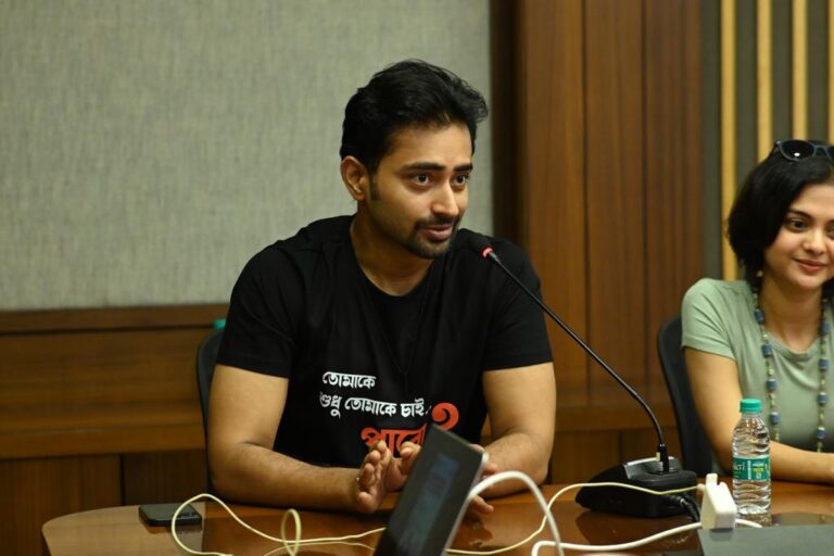 Celluloid, The Filmmaking Collective organized an Interactive session with the full Star Cast of ‘Sohorer Ushnotomo Dine’ on 14th July,2023 at the Society Hall from 11 AM onwards. Actor Vikram Chatterjee, Actress Solanki Roy, Aritra Sen (Director), Actor Debopriyo Mukherjee, and Actor Rahul Dev Bose from the Bengali cinema industry interacted at the event regarding their new movie, which is based on friendship, love, relationship, and how it hampers when someone relocates to a different city for work. It is a coming-of-age love story focusing on Ritoban and Anindita, two people from Kolkata, and how after a tragic event, they reflect on their ideal existence but are left with few options.