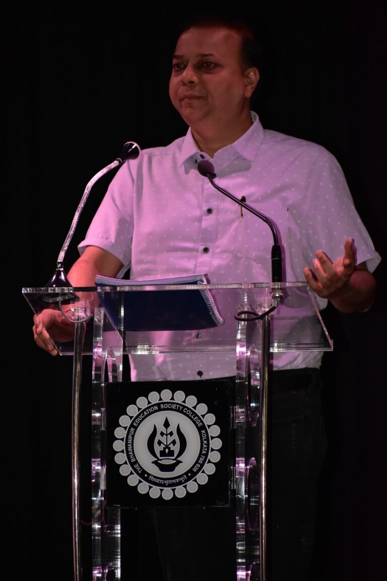 The Conference was inaugurated at 10.00 am with the ceremonial lighting of the lamp ceremony, followed by an invocation to the goddess Saraswati by the college student, Shubhalaxmi. Soon after, the Chief Guest of the day, Shri Pankaj Parekh, Chairman Eastern Region of Indo – Italian Chamber of Commerce & Prof. Dilip Shah, Dean of Students Affairs; The BESC and Mrs. Minakshi Chaturvedi, Coordinator, Department of Commerce (Morning Section) were welcomed on stage. Mr. Pankaj Parekh, a trusted figure in the college community, a mechanical engineer, and a renowned personality in the gems and jewelry industry, delivered an enlightening speech. He emphasized that education forms the foundation of all civilizations and promotes creativity and adaptability by providing clarity to one’s thoughts. Dr. Subhabrata Gangopadhyay, the TIC, The BESC felicitated Mr. Parekh acknowledging his contribution to the field.