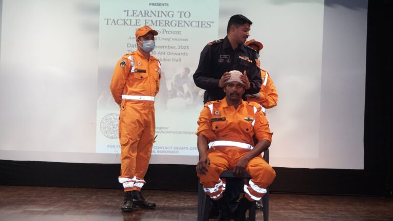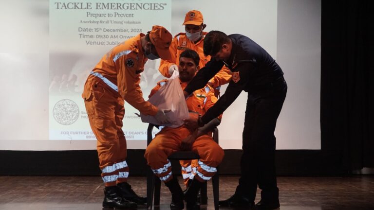 The Bhawanipur Education Society College & the NCC wing organized a workshop on “Learning to Tackle Emergencies” on December 15, 2023, at the Jubilee Hall of the college campus, starting at 9:30 am. The workshop drew a participation of approximately 230 individuals, including Umang volunteers, NCC cadets, and the faculties. The event was led by the 2nd Battalion of the National Disaster Response Force (NDRF), an Indian specialized force with the motto “आपदा सेवा सदैव.”