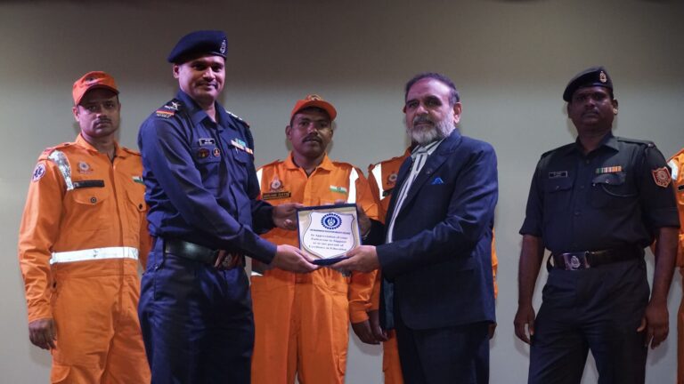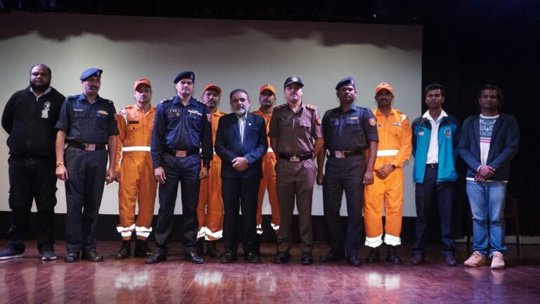 Inspector Abhay Kumar, serving as the speaker and session leader, initiated the session with a video presentation by the NDRF team. The video showcased the team’s commendable efforts in safeguarding people during disasters such as earthquakes, floods, and cyclones. Following the video presentation, Inspector Abhay Kumar, along with six NDRF officers, demonstrated crucial techniques, including evacuation drills, first aid basics, search and rescue procedures, communication protocols, emergency shelter setups, and rope & knot techniques.