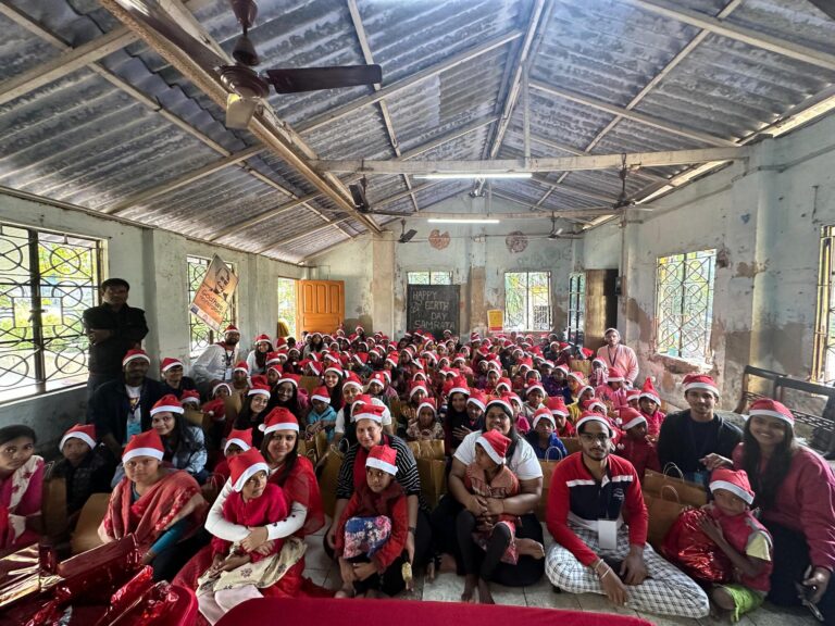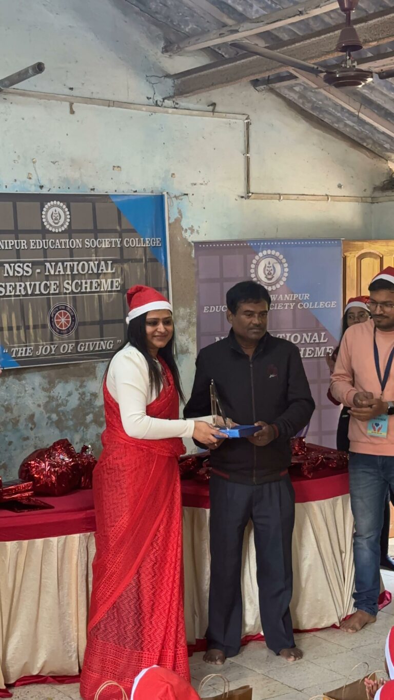 Twenty student volunteers, along with Prof. Gargi, NSS coordinator, arrived at the venue by 10 AM, making necessary arrangements and distributing food hampers and Santa Caps to the children.