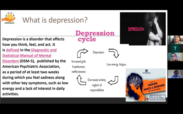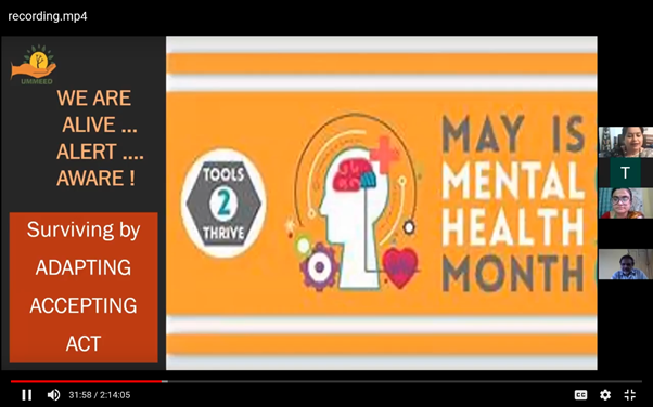 The month of May is observed as the Mental Health Awareness Month to raise awareness about mental health and to normalize the various social stigmas surrounding it. The webinar was extremely helpful as it helped the students connect with their concerns and differentiate between anxiety and depression and also helped in overcoming the same. The speaker explained the various causes and types of depression and why it is very critical to accept and seek professional help if needed. Overall, the event was extremely beneficial as we are all in midst of a pandemic and need to prioritize our mental health and well-being over every other thing. We need to identify what keeps us optimistic and moving.