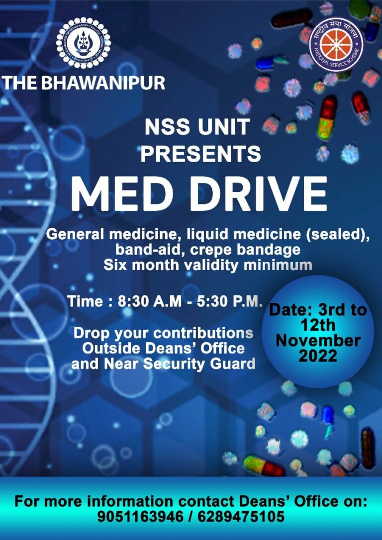 The project aims to reach out to old people who need medicines. The NSS Unit of The Bhawanipur Education Society College organized a “Med-drive” at Kamakhya Balakashram and Nadibhag Shri Ramkrishna Sevashram. On November 22, 2022, 2 students representing NSS and NSS coordinator visited Kamakhya Balakashram with a box full of medicines contributed by students and faculty members.
