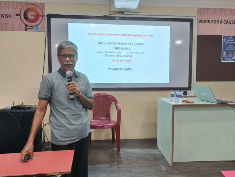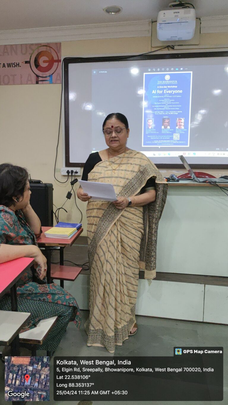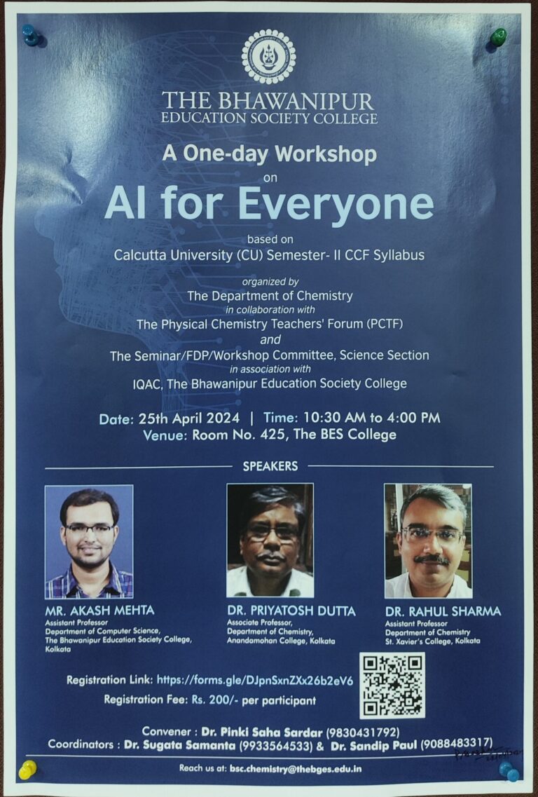 8. Brief description of the event: The inauguration of this workshop commenced with a welcome address by Dr. Sugata Samanta, Coordinator, The Bhawanipur Education Society College. He addressed all the dignitaries, speakers, participants, and everyone associated with this workshop on ‘AI for Everyone’. Dr. Samir Kanti Dutta, Dean of Science, The BES college highlighted the significance of Artificial intelligence in Calcutta University (CU) Semester- II CCF syllabus of Chemistry and its relevance in the era of high-performance of computing. Dr. Pinki Saha Sardar, Vice Principal, Science, Convener, The BES college delivered a speech on the importance of the Artificial intelligence in the developing country like India as well as in the World. The ceremony was graced by Dr. Sharmila Bhattacharya, Associate Professor, Department of Chemistry, Vidyasagar College, Working Member, PCTF, who delivered a speech on the development and various activities of PCTF along with the importance of AI in the under graduate curriculum.