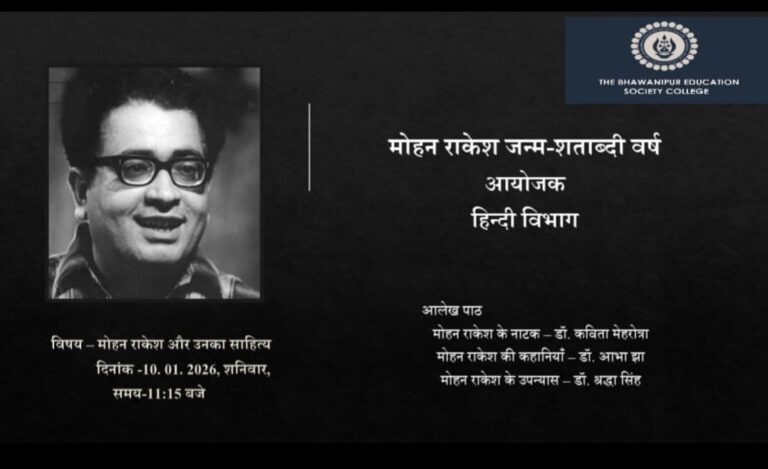 On Saturday, 10 January 2026, the Hindi Department organized a seminar on the occasion of the birth centenary year of Mohan Rakesh. The theme of the seminar was “The Literature of Mohan Rakesh.” On this occasion, Dr. Kavita Mehrotra, Head of the Hindi Department, presented her research-based views on the plays of Mohan Rakesh. Dr. Abha Jha shared her critical perspectives based on the short stories of Mohan Rakesh, while Dr. Shraddha Singh presented her paper focusing on his novels.