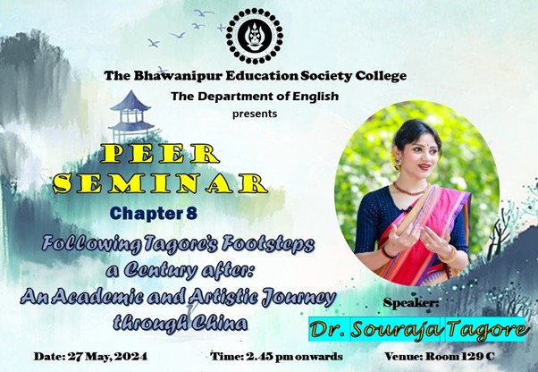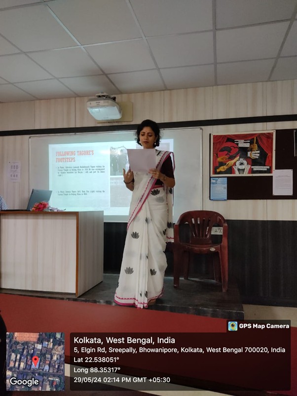 Brief description of the event: The Department of English, The Bhawanipur Education Society College organised Peer Seminar: Chapter 8 on 29th May, 2024 at 1:45 pm. The speaker was Dr. Souraja Tagore; her paper was entitled “Following Tagore’s Footsteps a Century After: An Academic and Artistic Journey through China”. In her presentation she shared her experience of her recent visit to China as an artist and scholar. The Consulate General of The People’s Republic of China in Kolkata made intensive preparations to mark Rabindranath Tagore’s centenary visit to China in April 2024. Dr. Souraja Tagore, Assistant Professor, The Bhawanipur Education Society College, Kolkata, was invited to China from 10th -18th April 2024 to commemorate Tagore’s visit to China. Beijing, Shenzhen, and Shanghai were among the major cities she visited. Scholars, artists, and students exchanged ideas during seminars, cultural events, historic site visits, and academic symposiums. Souraja also shared her experience of visiting the Centennial Lilac Poetry Festival of Fayuan Temple in Beijing on 17th April 2024. The seminar was held in Room 515 from 1:45 pm; it was attended by faculty members, PG semester III students along with a few UG semester V students of the Department of English.