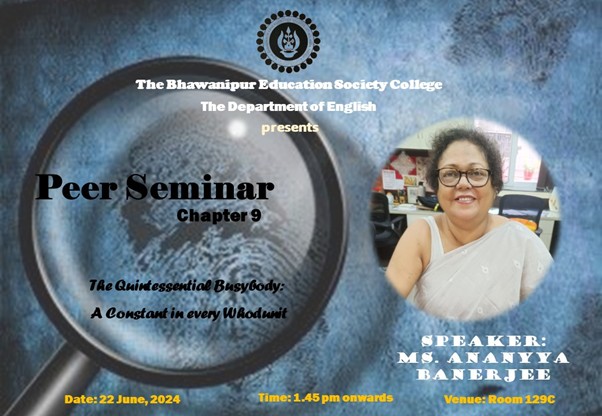 The Department of English, The Bhawanipur Education Society College organised Peer Seminar: Chapter 9 on 22nd June, 2024 at 2:00 pm. The speaker was Prof. Ananyya Banerjee; her paper was entitled “The Quintessential  Busybody: A Constant in every Whodunit”.The seminar was held in Room 129 C from 2:00 pm; it was attended by faculty members, PG semester III students along with a few UG semester V students of the Department of English.  The paper focused on the role of the Busybody in detective fiction where the private detective is identified as the Busybody. Prof. Banerjee took the audience down the memory lane where amateur detectives in Enid Blyton books were an essential part of a child’s reading list. Concentrating on the Golden age of the Whodunnits, Prof. Banerjee, commented on the rise of the detective in literary fiction and how they served as an essential part of contemporary society.
