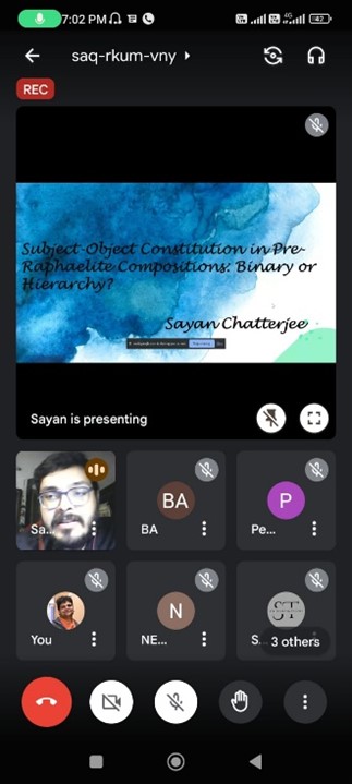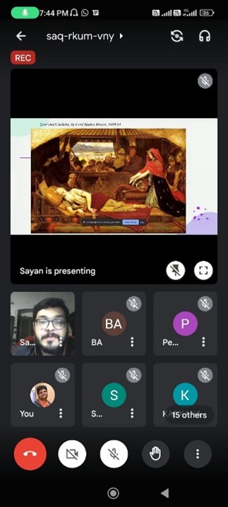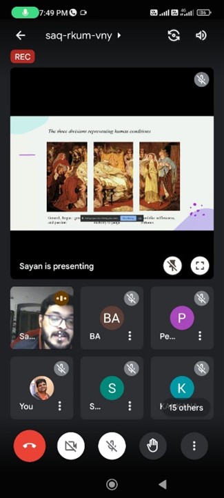 The Peer webinars are a unique monthly endeavour by the Department of English, The Bhawanipur Education Society. The primary objective for initiating and curating such a unique exertion is to create an exposure for students and inspire them for research and higher education. The Department of English, The Bhawanipur Education Society College organized Peer Seminar Chapter: 15 on 30th January, 2023 at 7:00 PM. The speaker was Mr. Sayan Chatterjee; his paper was entitled- “Subject-Object Constitution in Pre-Raphaelite Compostions: Binary or Hierarchy?” The seminar was attended by the faculty members and the students from PG Semesters I and III of the Department of English.