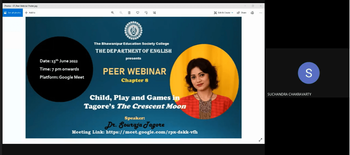 The Department of English, The Bhawanipur Education Society College organized Peer Webinar: Chapter 8 on 13th June, 2022 at 7 pm. The speaker was Dr. Souraja Tagore; her paper was entitled Child, Play and Games in Tagore’s The Crescent Moon. The webinar was held on Google Meet; it was attended by faculty members and the PG Semester IV students of the Department of English.