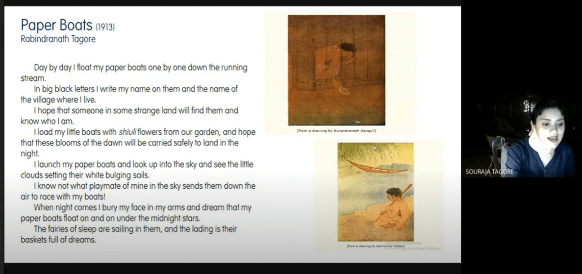The Peer Webinars are a unique monthly endeavour by the Department of English, The Bhawanipur Education Society College that has facilitated an amiable atmosphere for the exchange of research ideas. In the eighth chapter of this series of webinars, Dr. Tagore brought out the multiple nuances associated with children’s play as represented in The Crescent Moon. This is an anthology of poetry compiled by Tagore which consists of his English translations of some of his poems from his Bengali poetry-anthologies, namely Kari o Komol, Kanika and Gitanjali. These poems were chosen and arranged keeping in mind a Western audience. On its publication in 1913, The Crescent Moon was appreciated by London periodicals for the portrayal of a vision of childhood which could only be paralleled by that of William Blake.