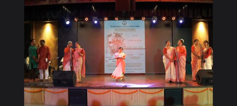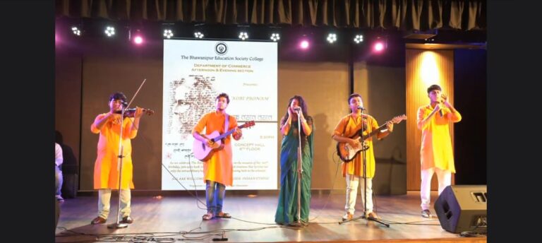 The celebration commenced with a welcome address by the coordinator of the student activities committee and programme coordinator, Ms. Arundhati Mazumder, followed by the inaugural session with a symbolic gesture of reverence as the lamp was ceremoniously lit and a garland was regardfully placed upon Rabindranath Tagore’s ethereal portrait, honouring the timeless legacy of Tagore’s literary brilliance by Dr. Subhabrata Ganguly, the Teacher-in-Charge of The BESC; Dr. Sandip Dan, Rector of The BESC; Mr. Saspo Chakraborty, Vice-Principal (Dept of Commerce Aft. & Eve. Section) of The BESC; Prof. Dilip Shah, Dean of Student Affairs at The BESC; Ms. Paramita Chakravarty, Coordinator of M. Com at The BESC; and Ms. Atreyee Ganguly, Coordinator of the Department of Commerce (Afternoon and Evening Section), The BESC.